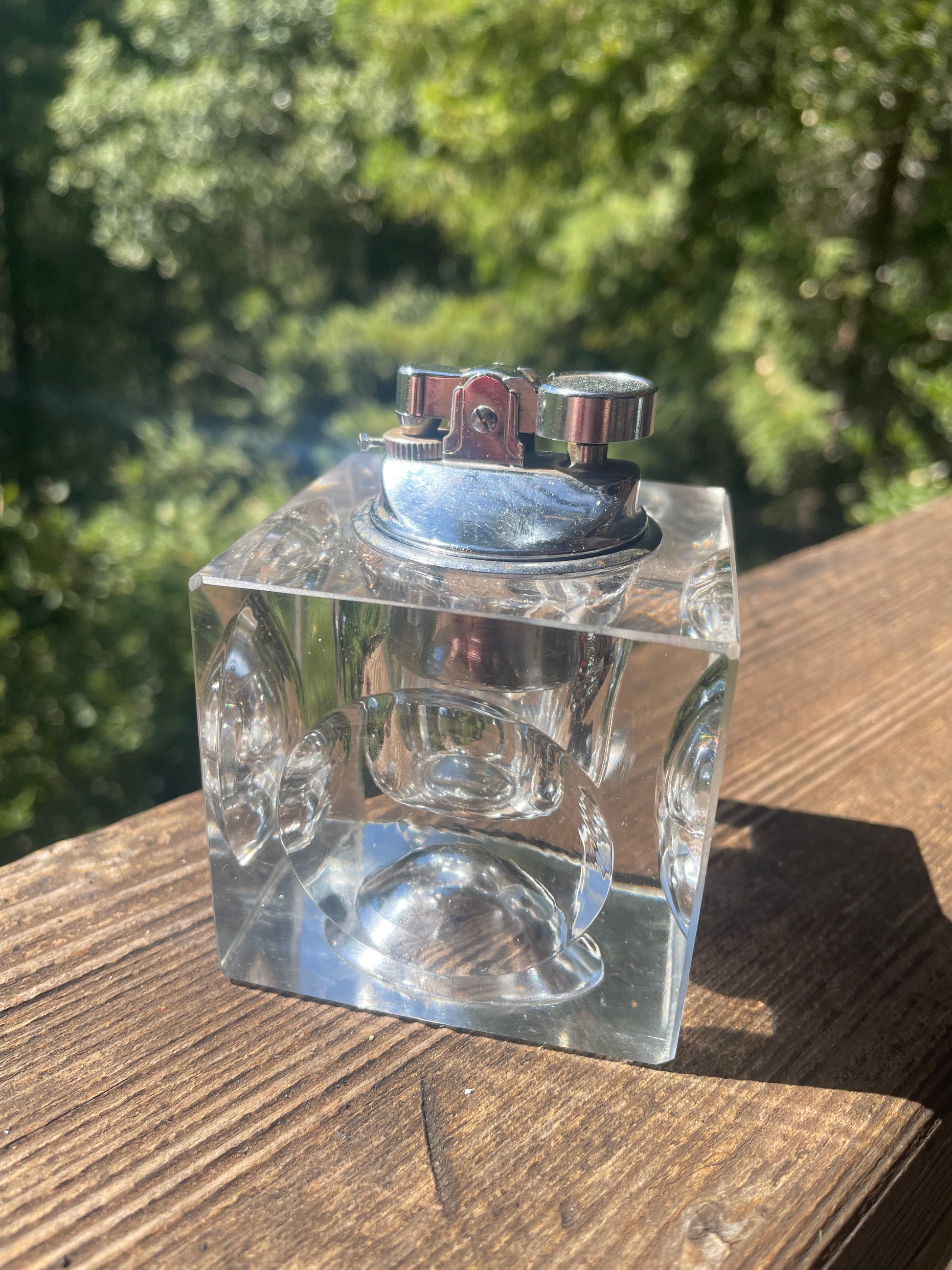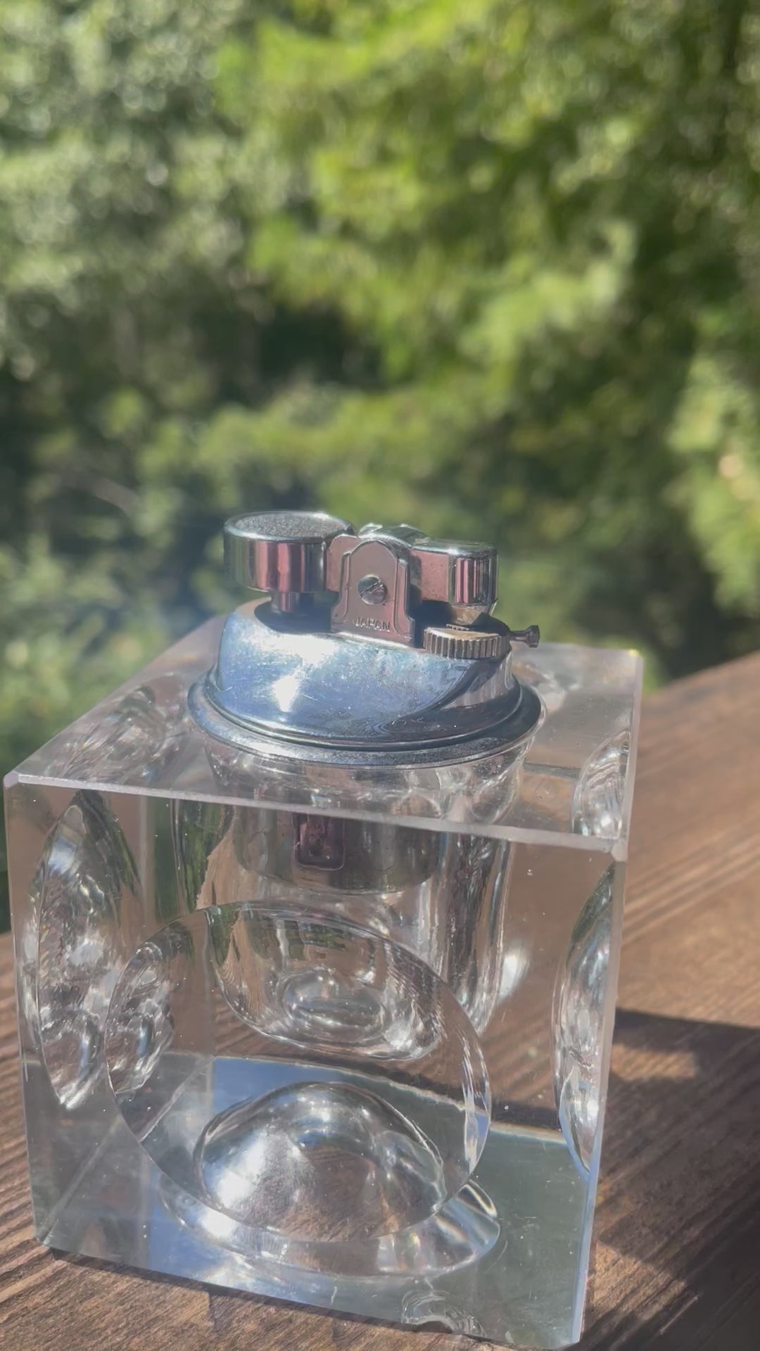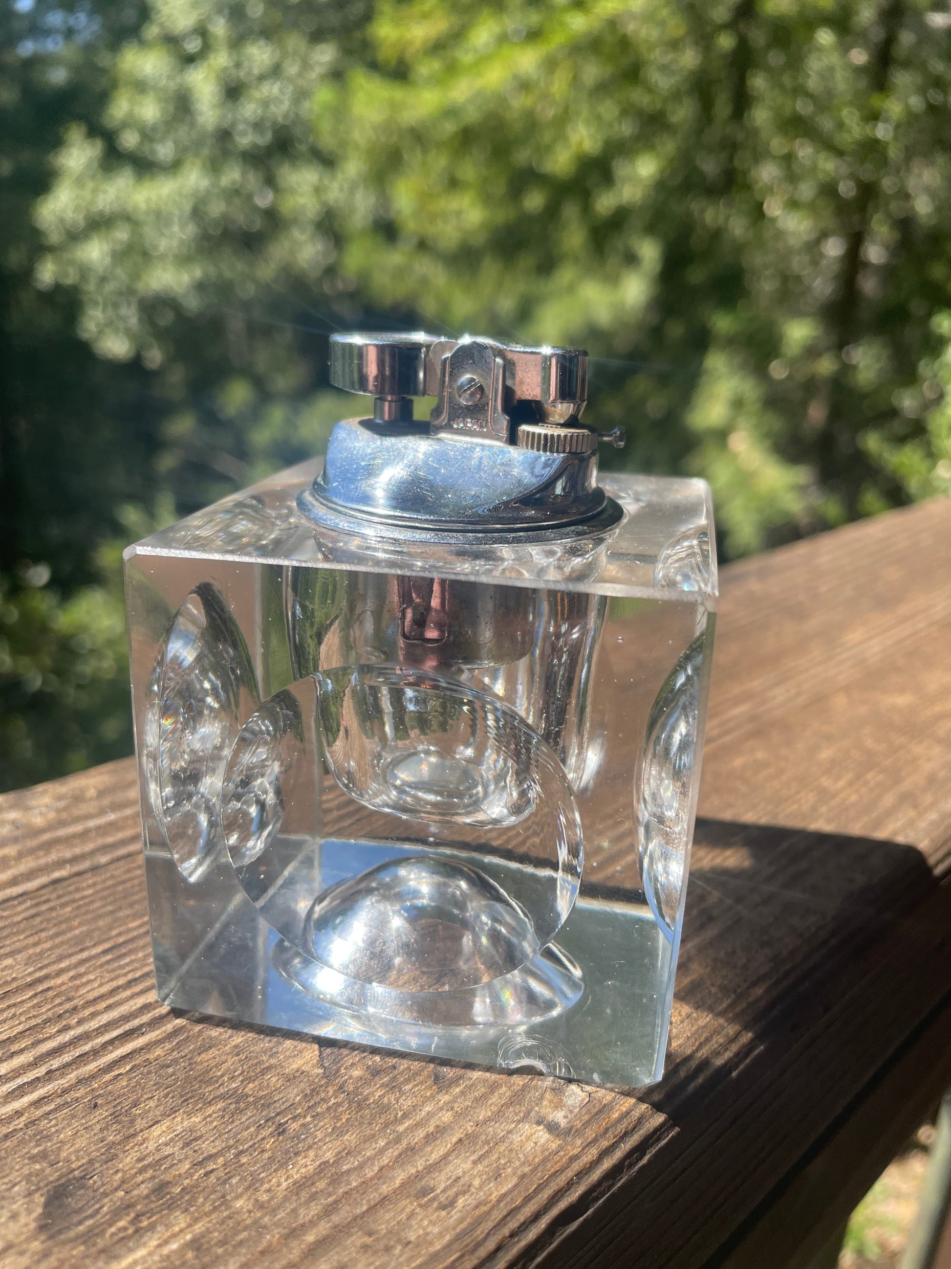 This vintage 1960s Crystal Block Butane Table Lighter is a unique and stylish addition to any collection. Crafted from cut crystal, this lighter features a powerful butane fuel source and a large flame for all your lighting needs. Please note, the adjuster does not work, but it still provides a substantial flame for all your lighting needs.