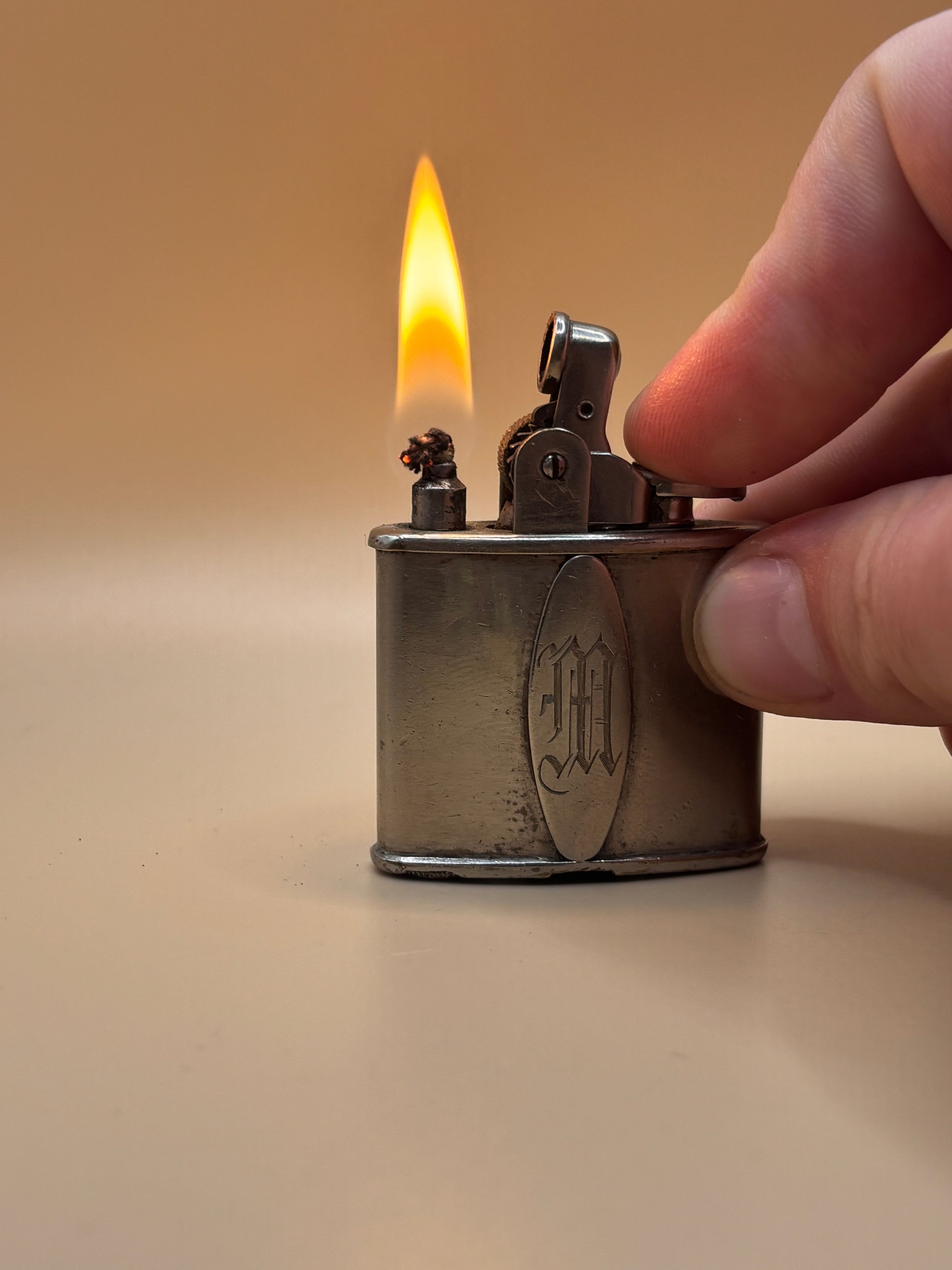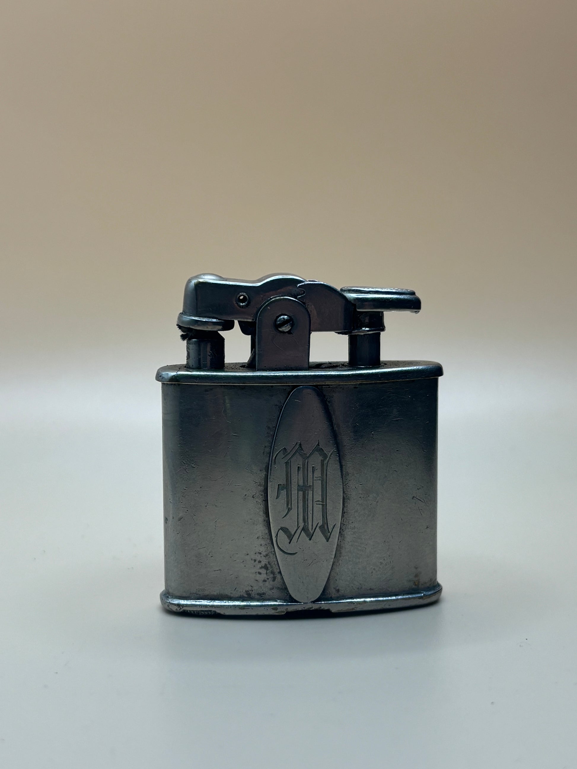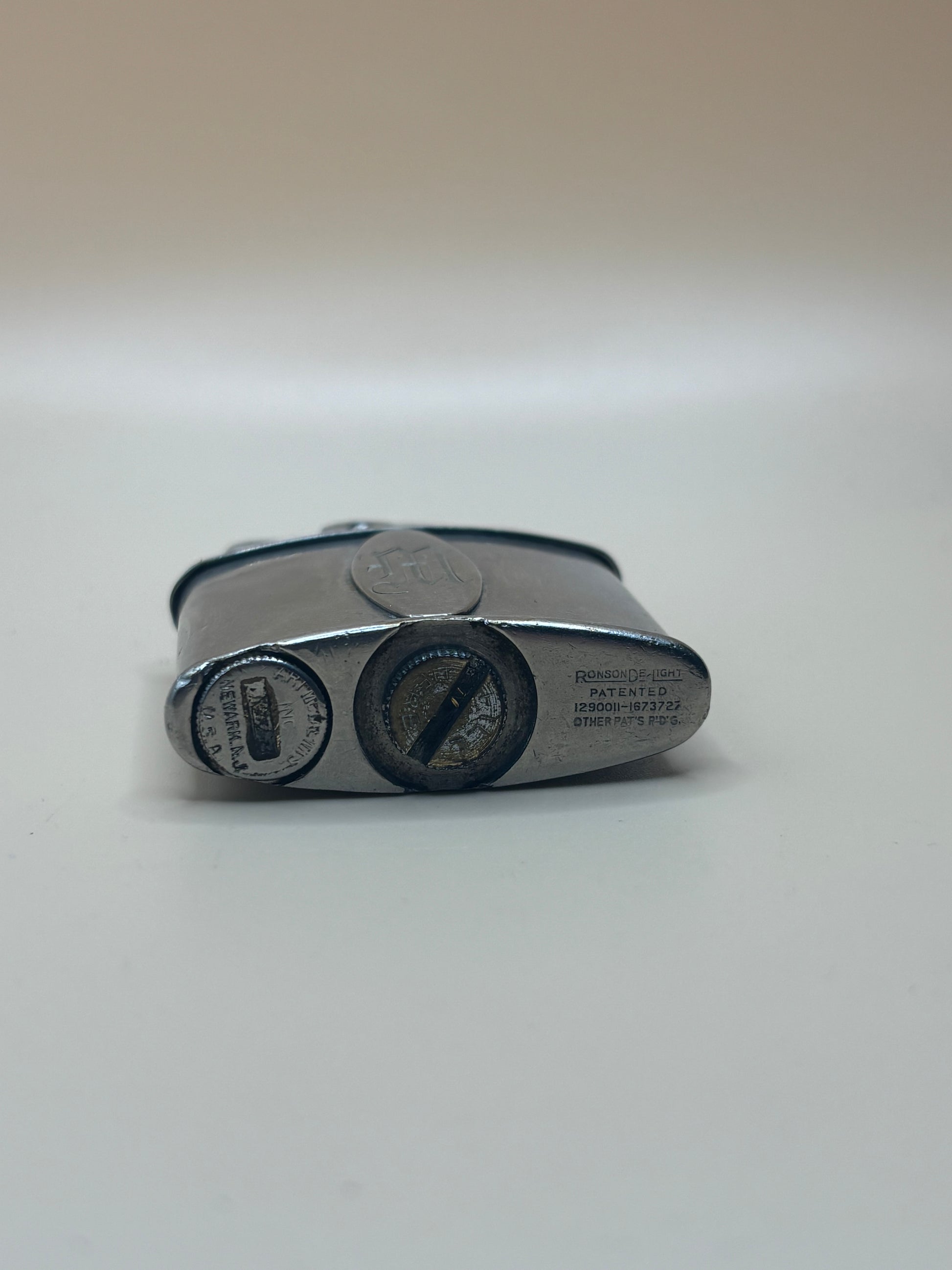 Discover the magic of the past with the c. 1920's Ronson De-Light! This vintage pocket lighter is not only a piece of history, but also a stunning example of early art deco design. With the initials 'M' etched onto its surface, this lighter adds a touch of elegance to any collection.