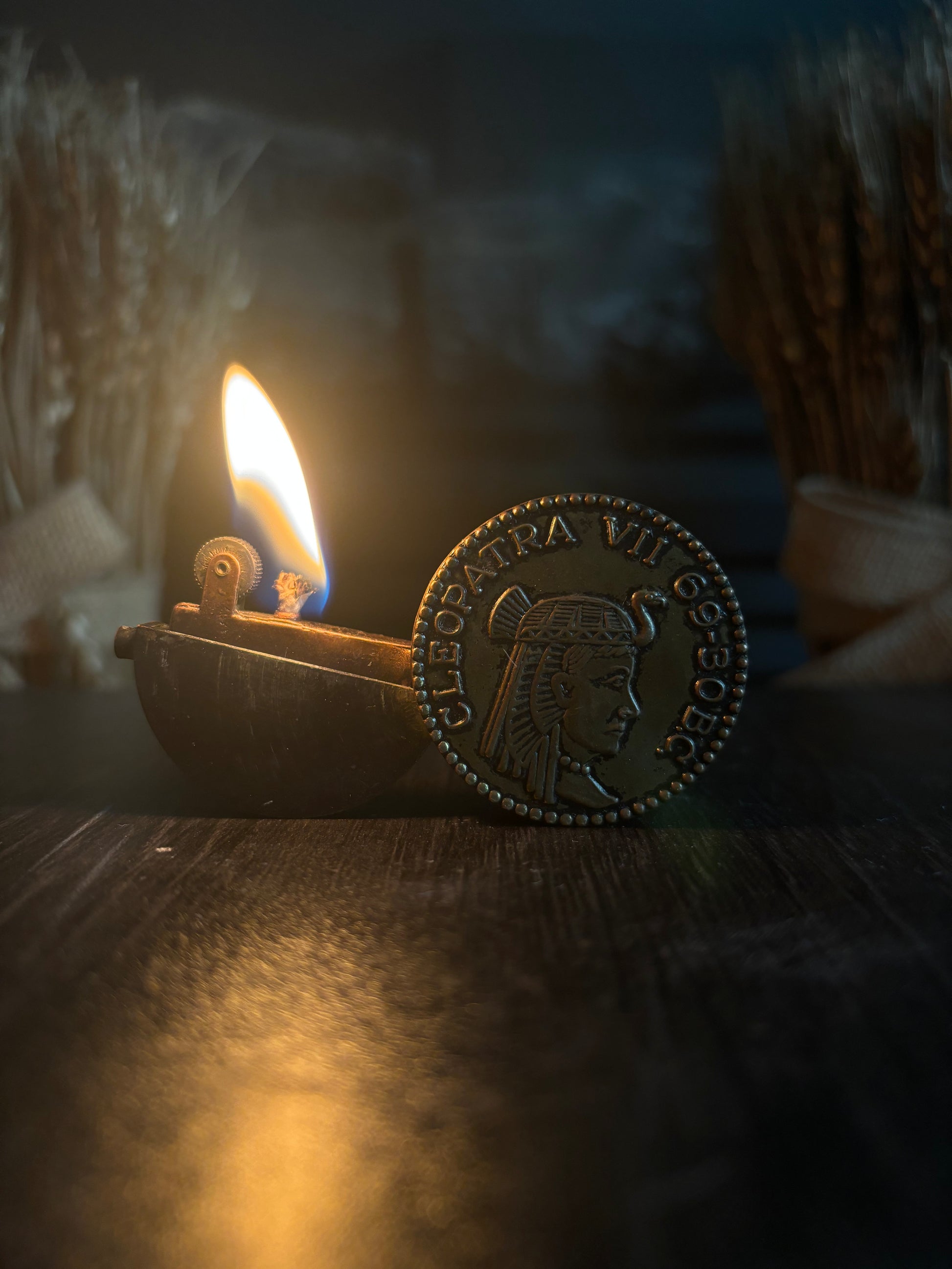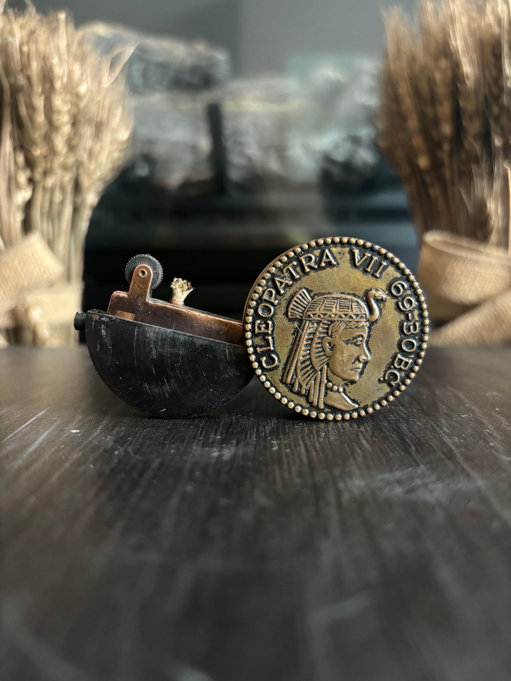 This c. 1960’s Cleopatra Coin-style lighter is adorned with a depiction of Cleopatra, reading ‘Cleopatra VII 69-30 BC’. The back of the lighter is fit with a small mirror! Spark up your style today with this beautiful classic!