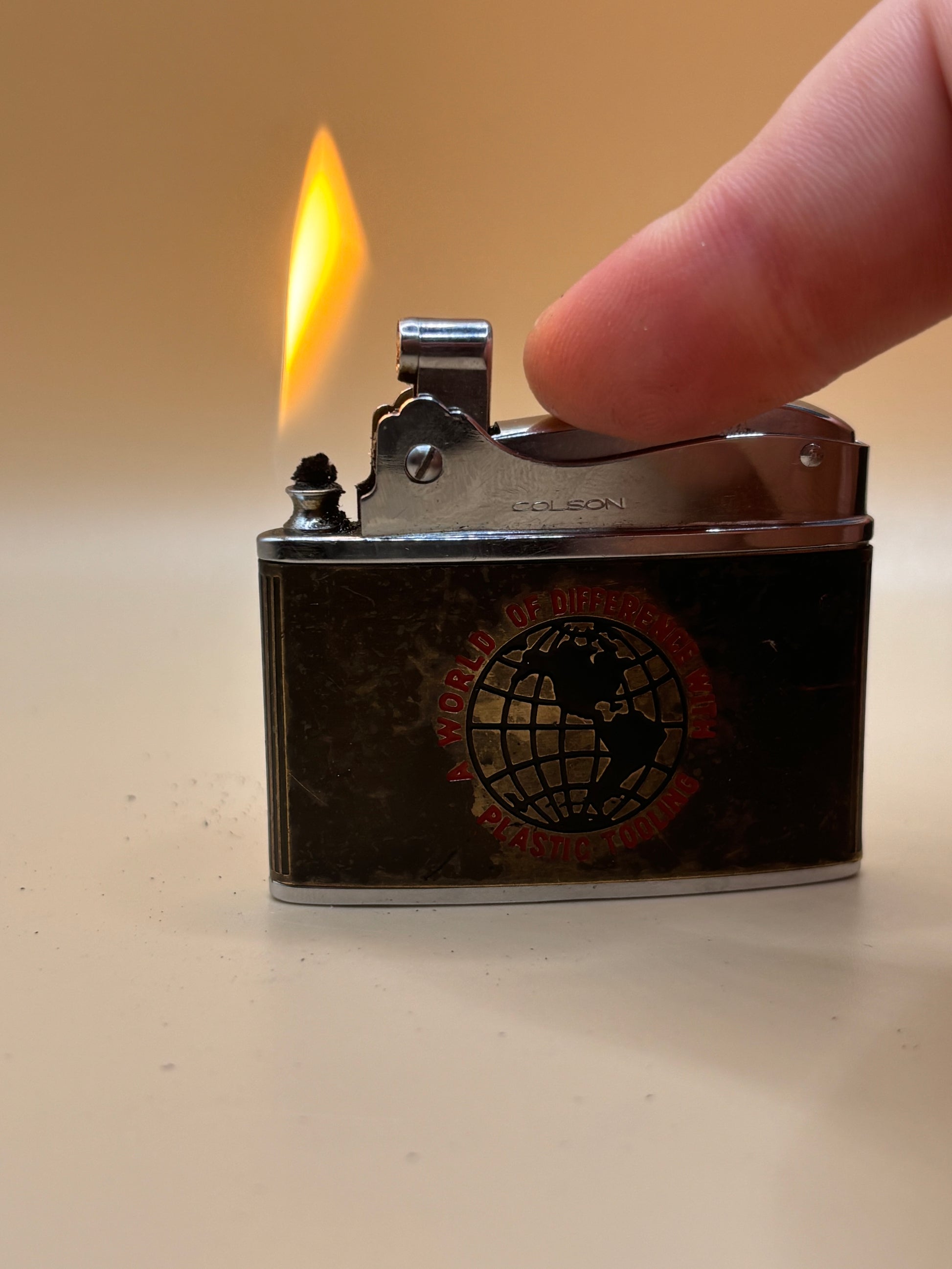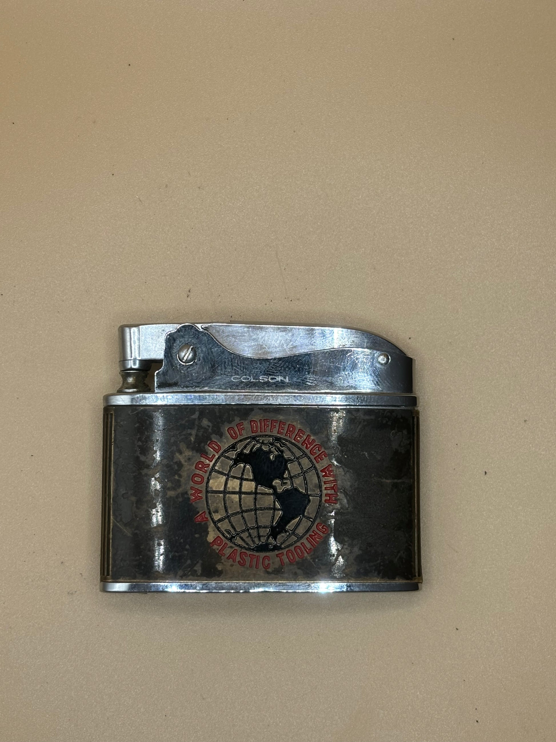 Experience a piece of history with our c. 1960's Latrobe Plastic Co. flat lighter. Made by Colson Co. in Japan, this unique lighter features a wonderful patina and bears the company's iconic slogan "A World Of Difference With Plastic Tooling". A must-have for vintage lighter enthusiasts and lovers of history.