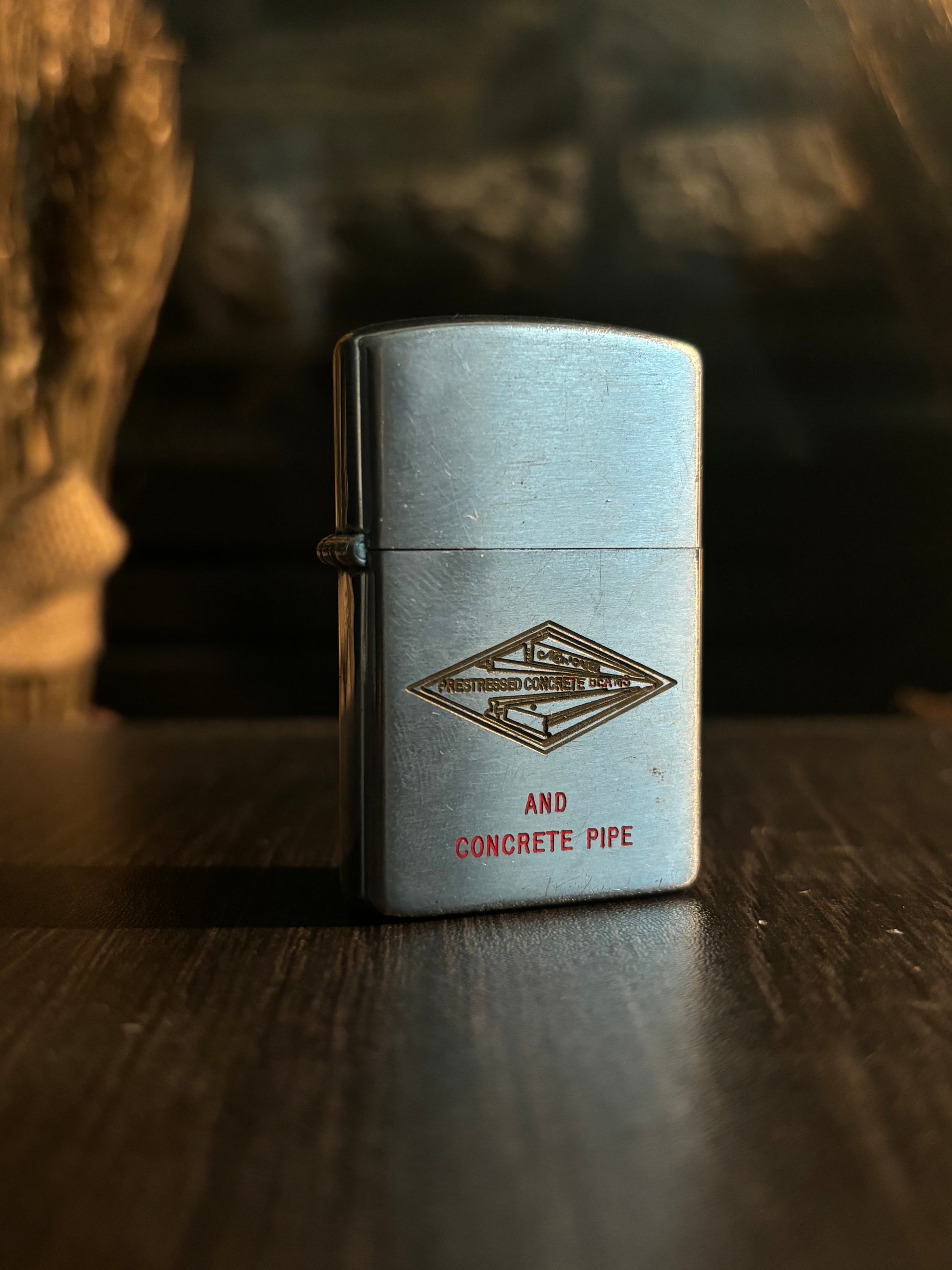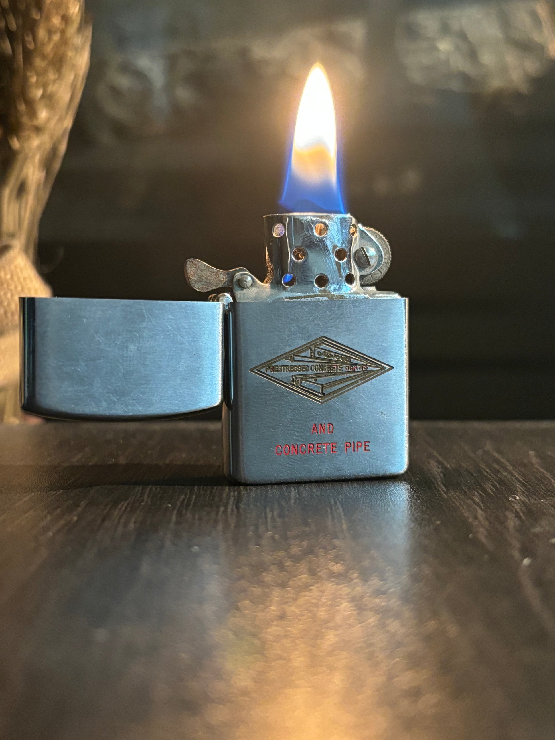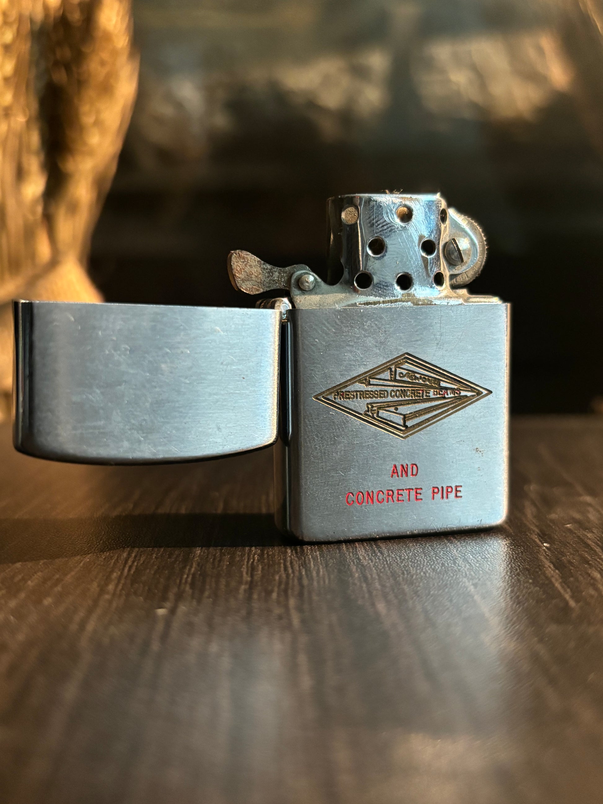 Get your hands on this vintage 1960's Shaw-Barton Flip Top Advertisement Lighter! Made in Japan, this lighter features an advertisement for a concrete beam and pipe company. Perfect for those who love collecting vintage lighters, add it to your collection or use it as a unique conversation starter.