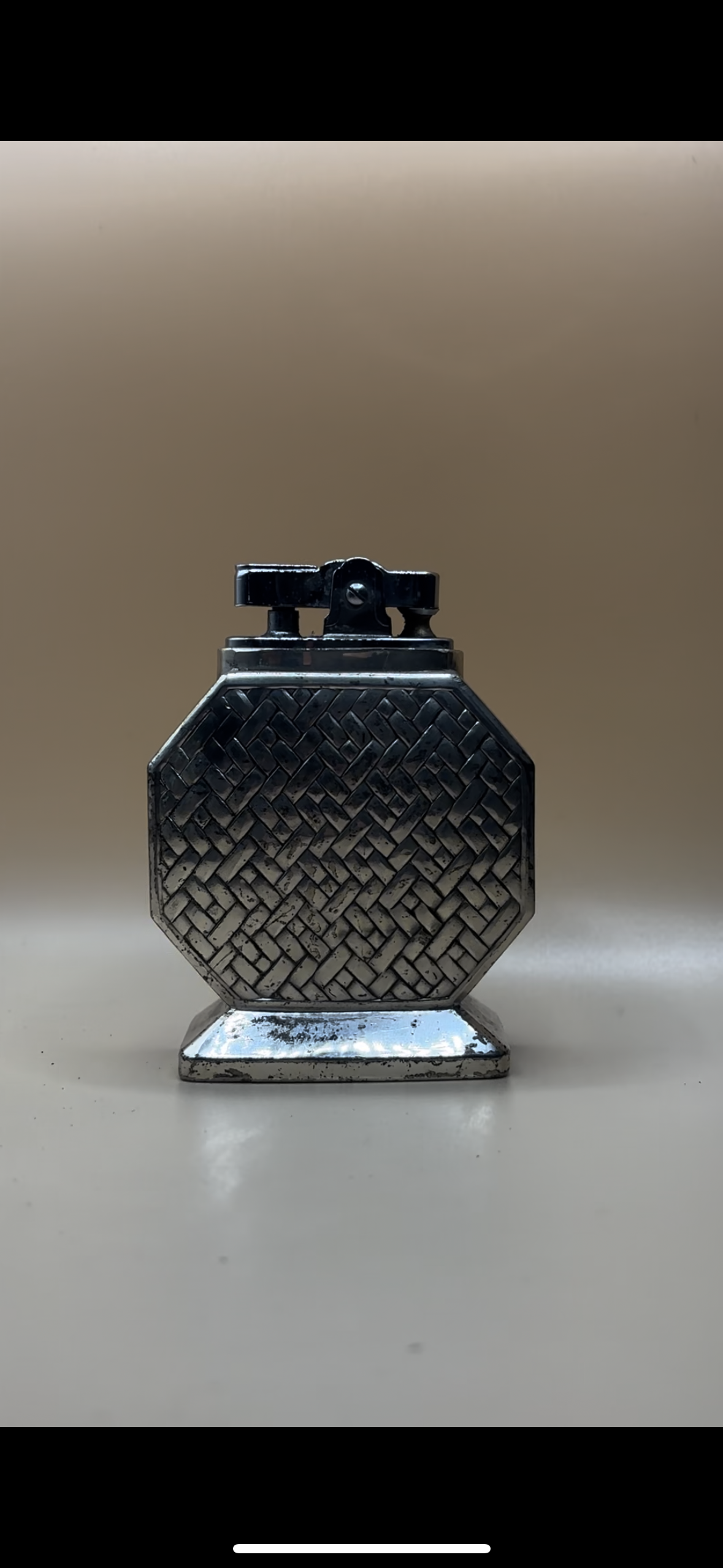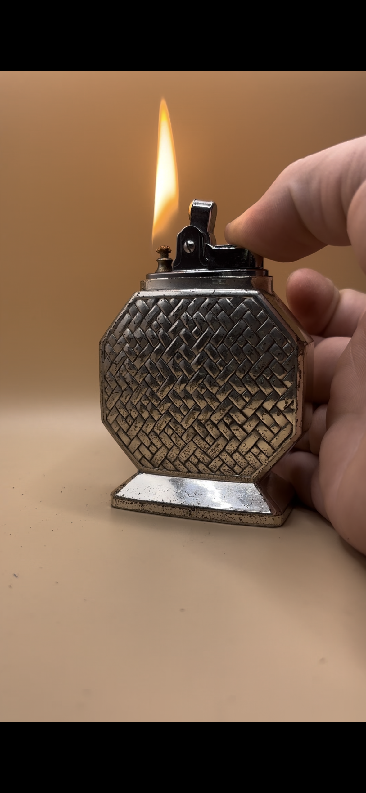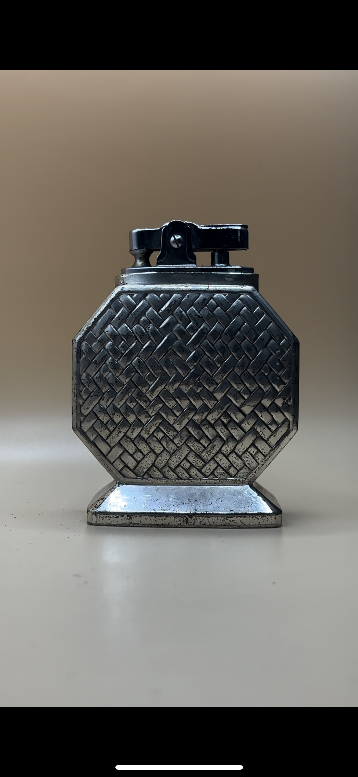 Add a touch of vintage charm to any room with our c. 1960’s Woven Pattern Table Lighter. With its unique Basket-Woven design and origins in Japan, this conversation starter is a must-have for any collector. Light up your space and your conversations with this gorgeous vintage piece.