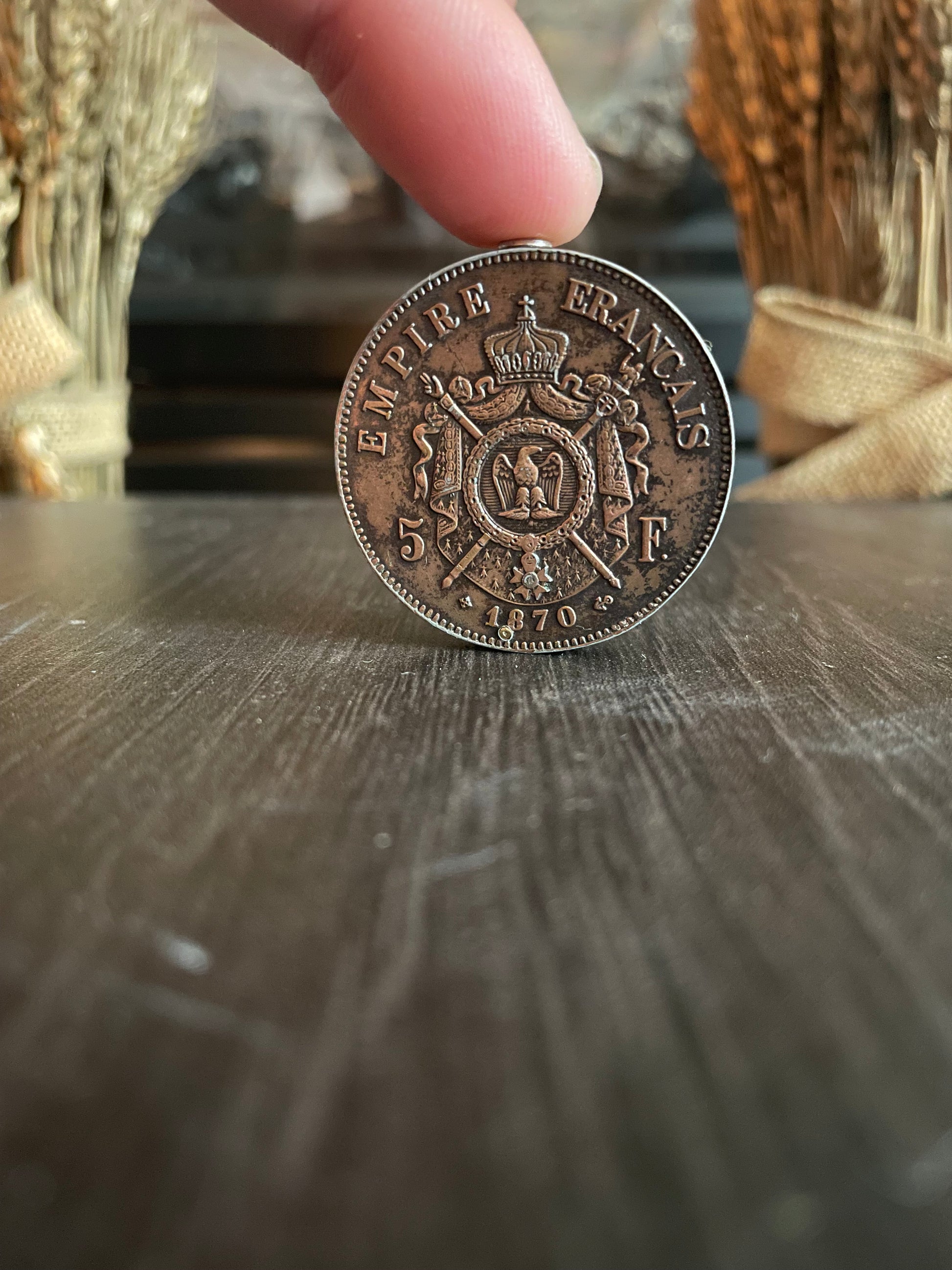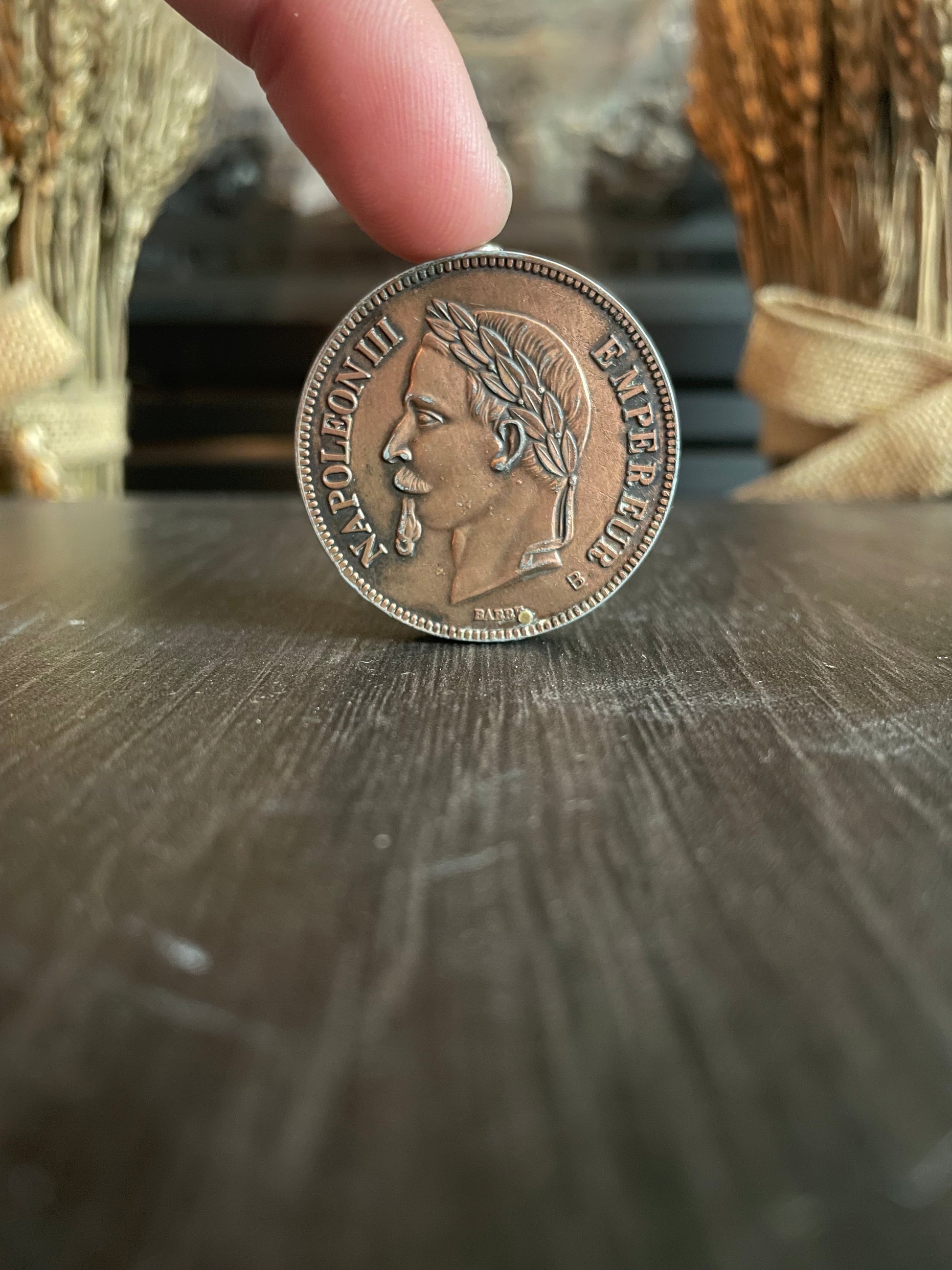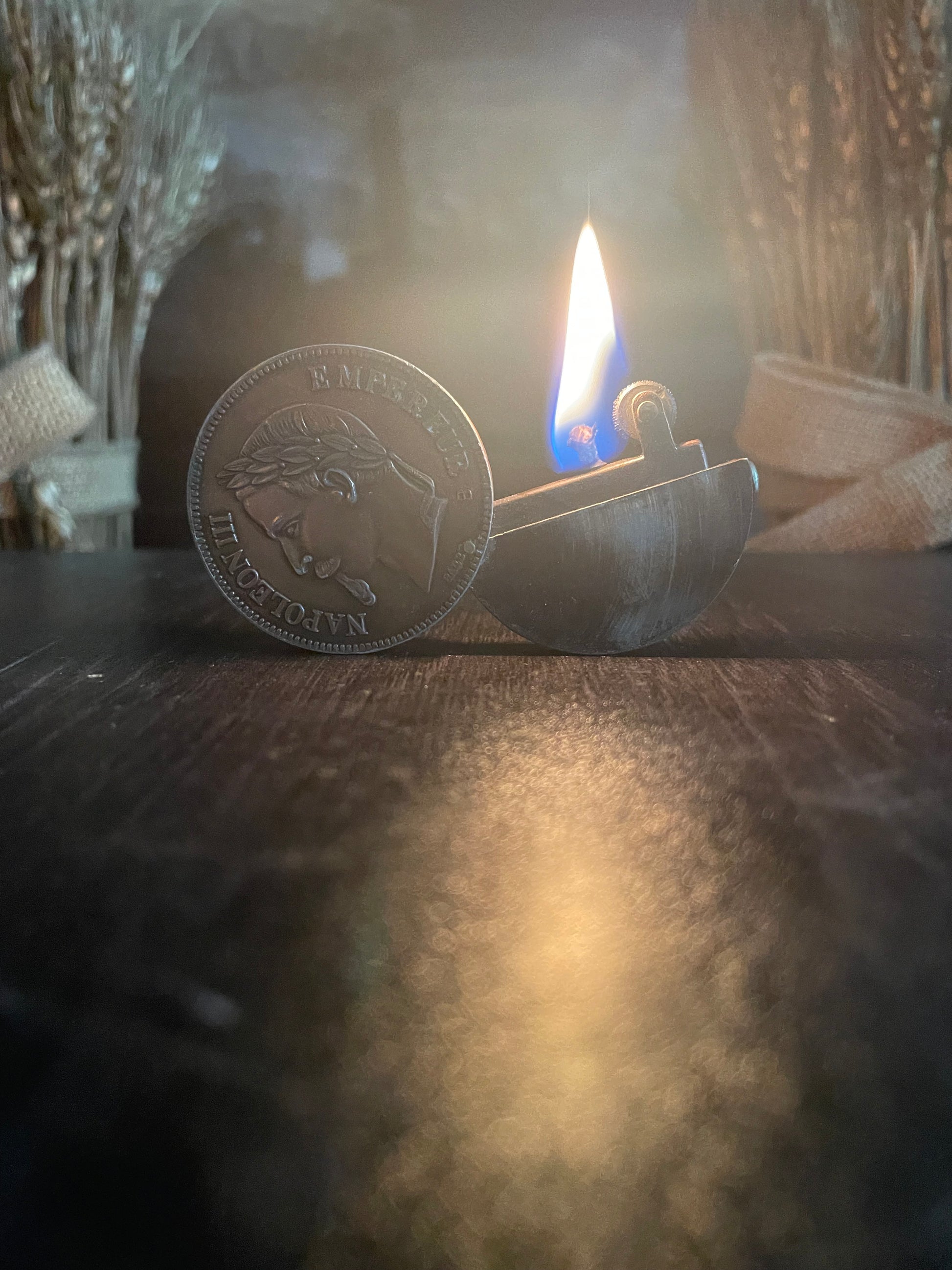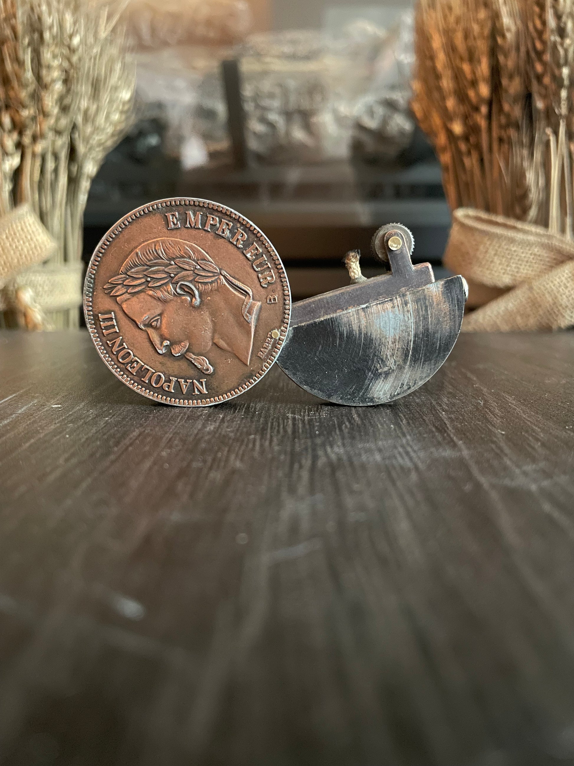Light up in style with our c. 1960s Napoleon III Coin Lighter. This vintage coin style lighter not only boasts a unique design, but also features a dated 1870 Napolean III coin. A must-have for any collector or fan of vintage lighters. Get yours today!