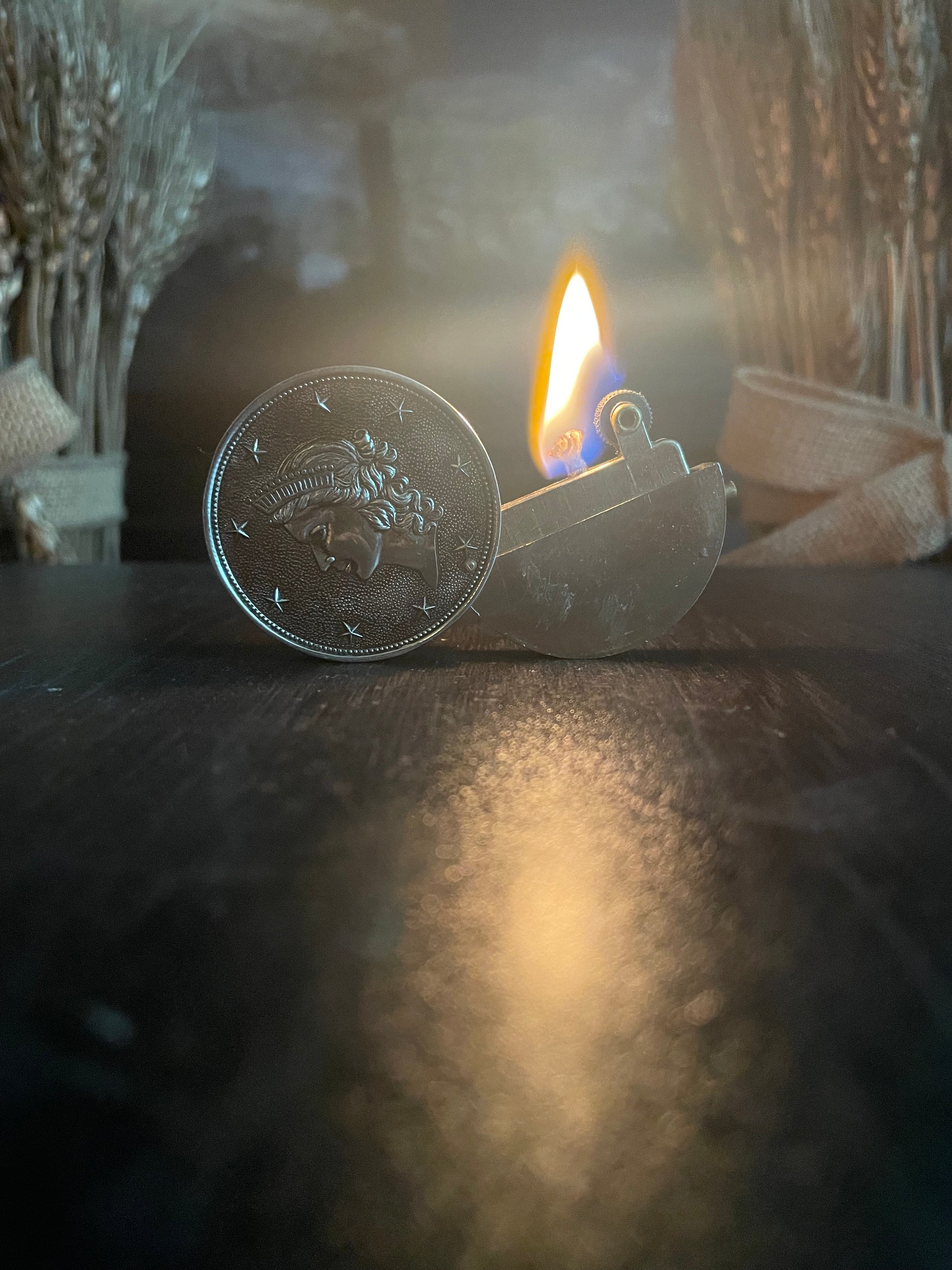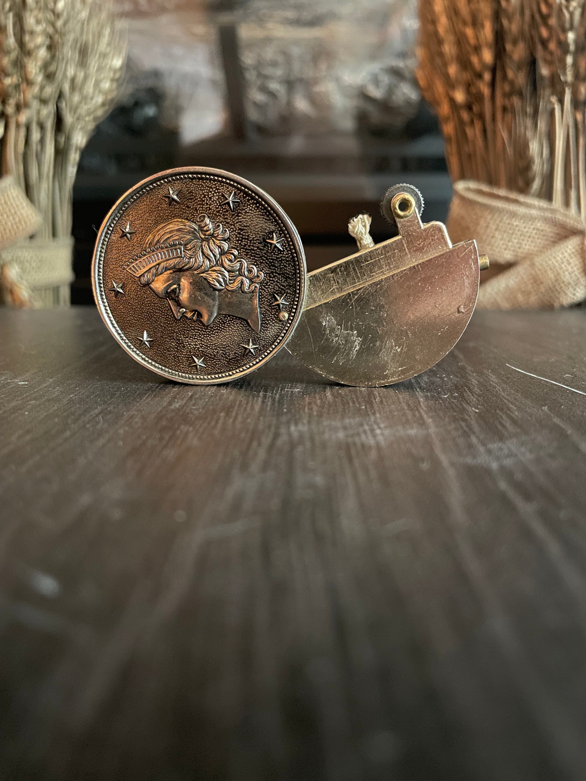 This vintage lighter, made around the 1960s, features an image of the Statue of Liberty's head and Liberty eagle. Its coin shape adds a unique touch. Light up with a piece of American history.