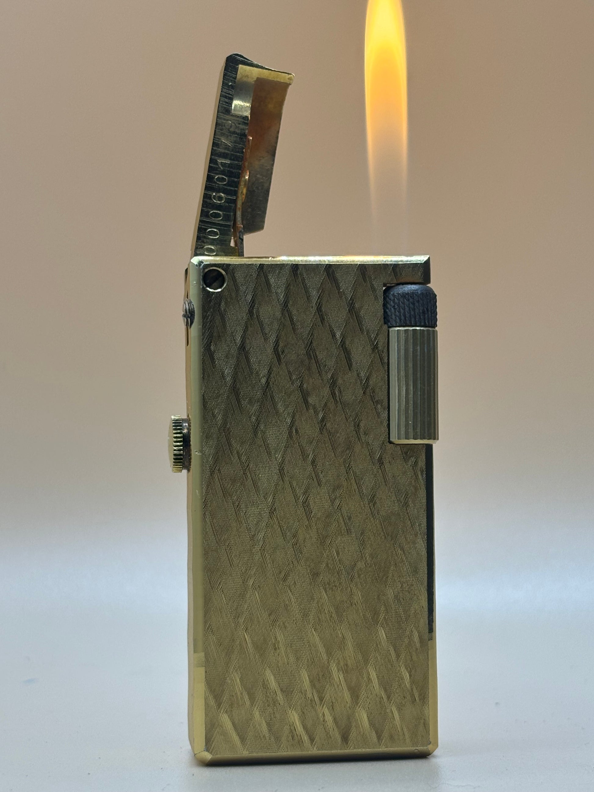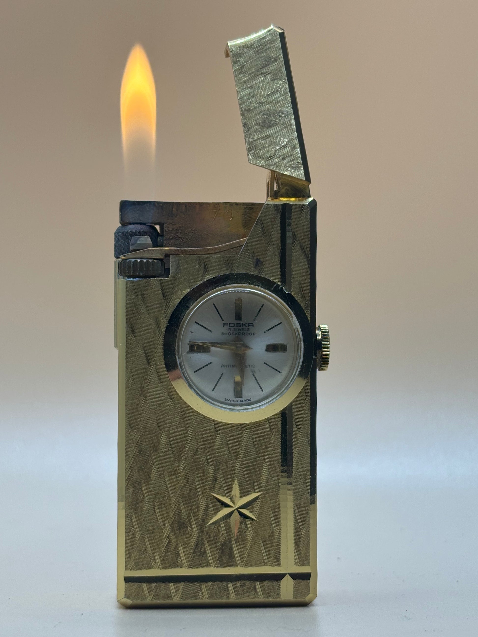 Revive the nostalgia of the 70's with the c. 1970's Fosker Clock Lighter! This Swiss-made clock-watch lighter is a rare, functional piece that exudes class. The working lighter and clock add to its unique charm. A must-have for vintage and lighter enthusiasts!