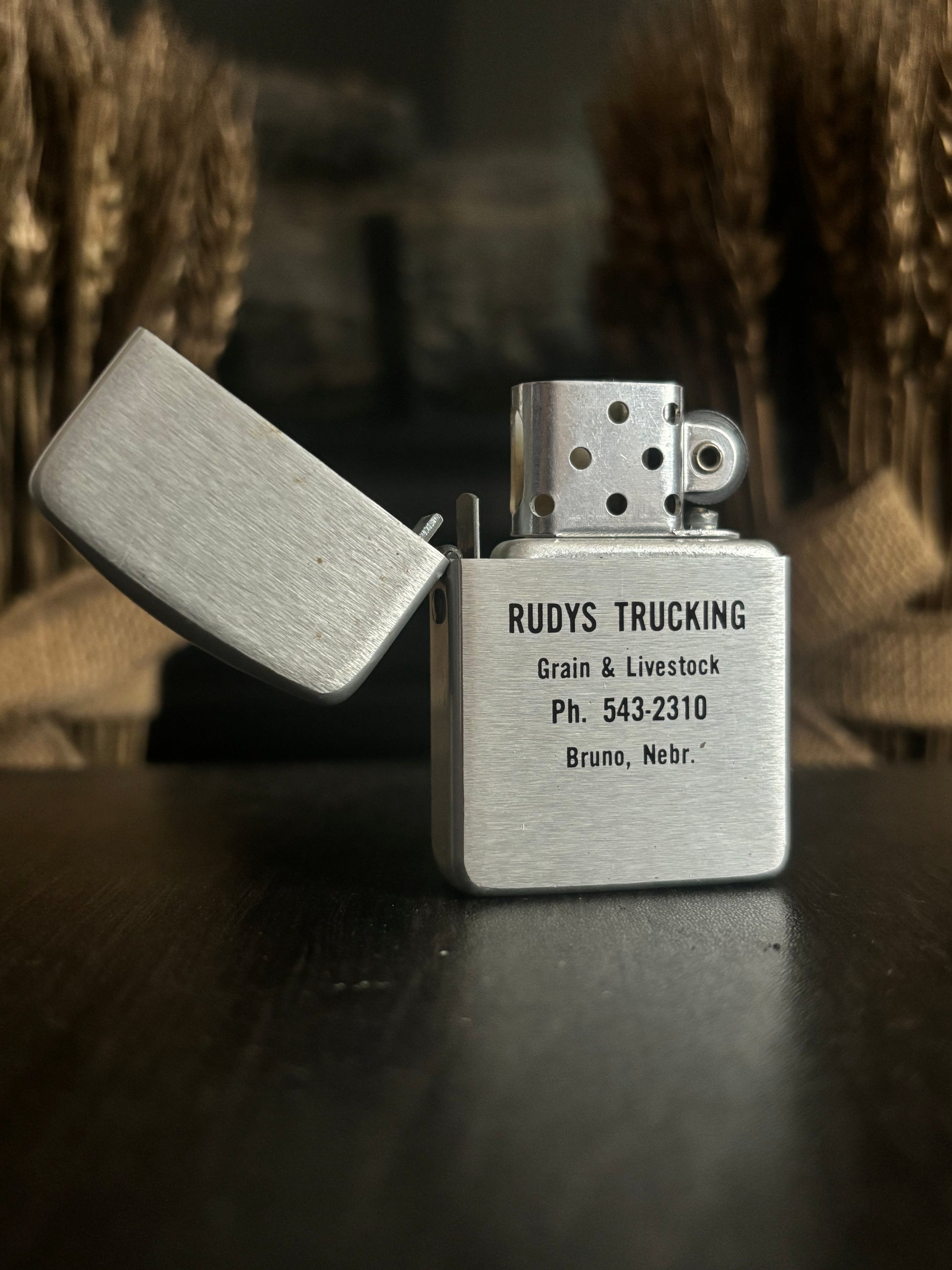 Fuel your love for vintage lighters with this c. 1970's Park Lighter featuring Rudy's Trucking advertisement. Crafted by Park Lighter Co in the USA, this flip top lighter showcases the iconic Rudy Trucking grain and livestock company from Bruno, Nebraska. Add a piece of history to your collection today!