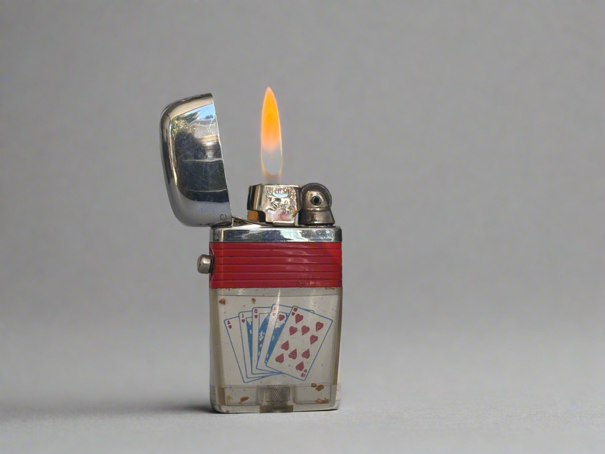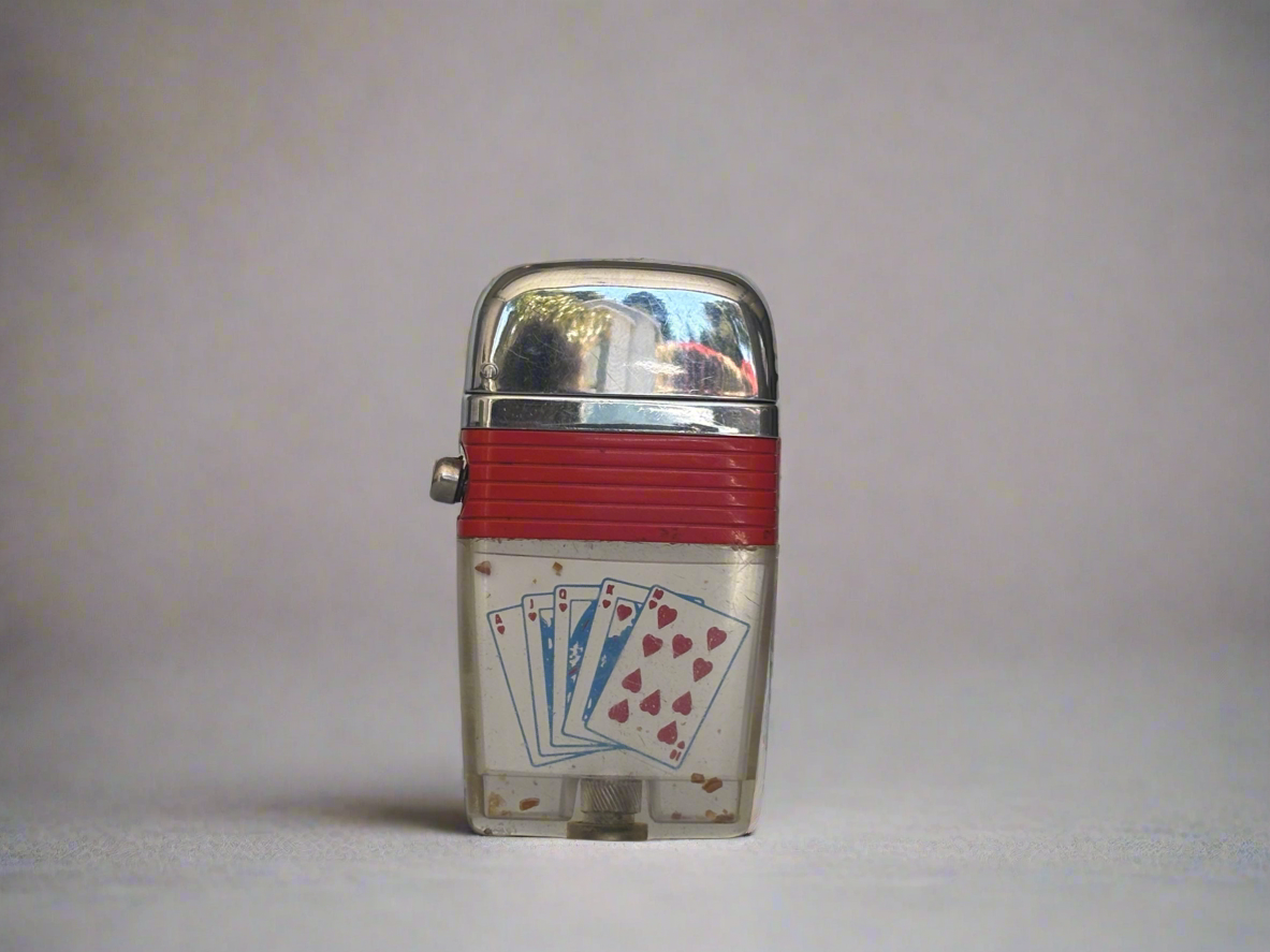Experience vintage charm with our iconic c. 1970's Scripto Vu-Lighter. Its see-through tank adds a touch of wonder, while also showcasing playful playing cards. Perfect for collectors and lovers of nostalgia alike! Happy Holidays!