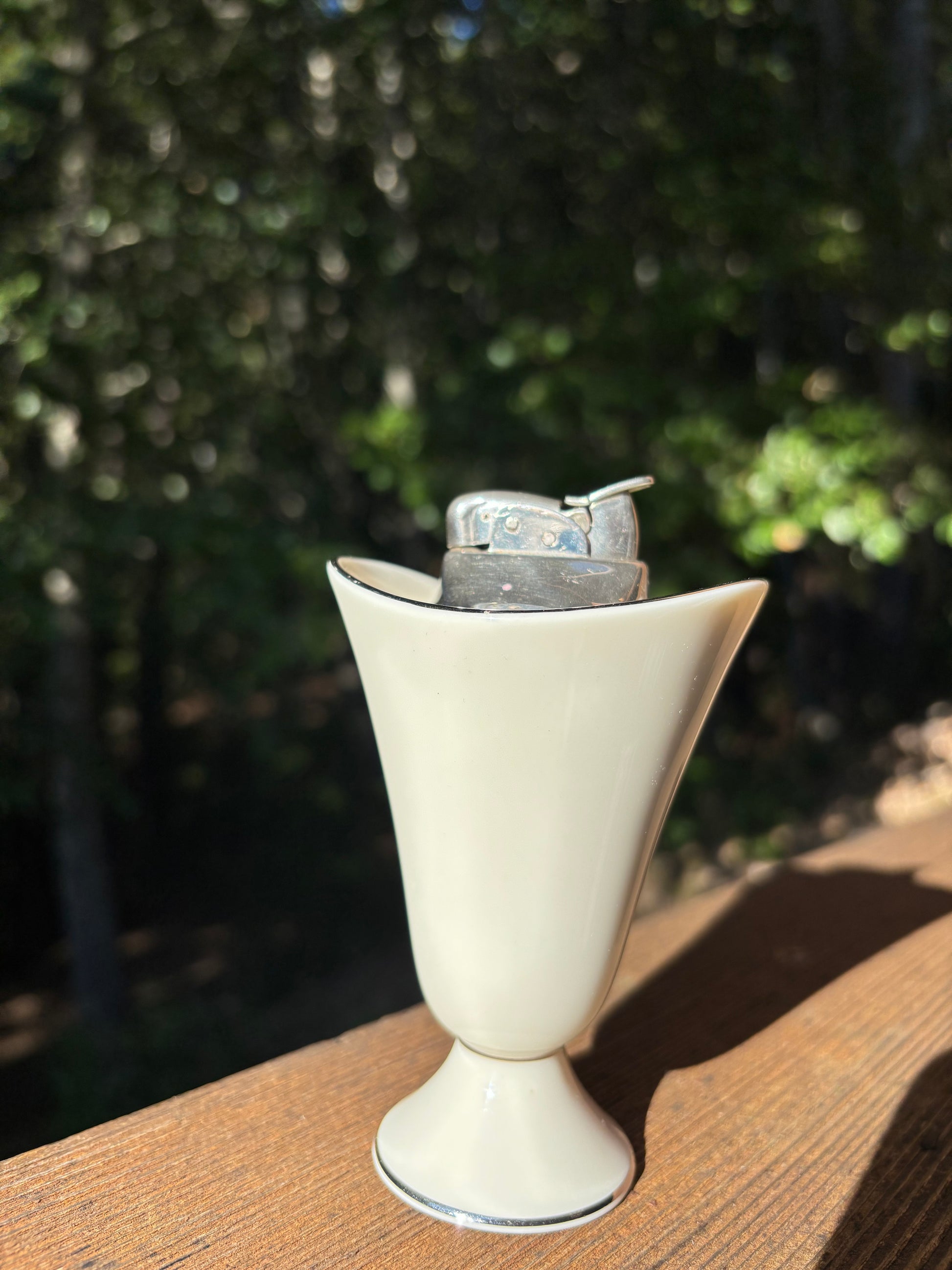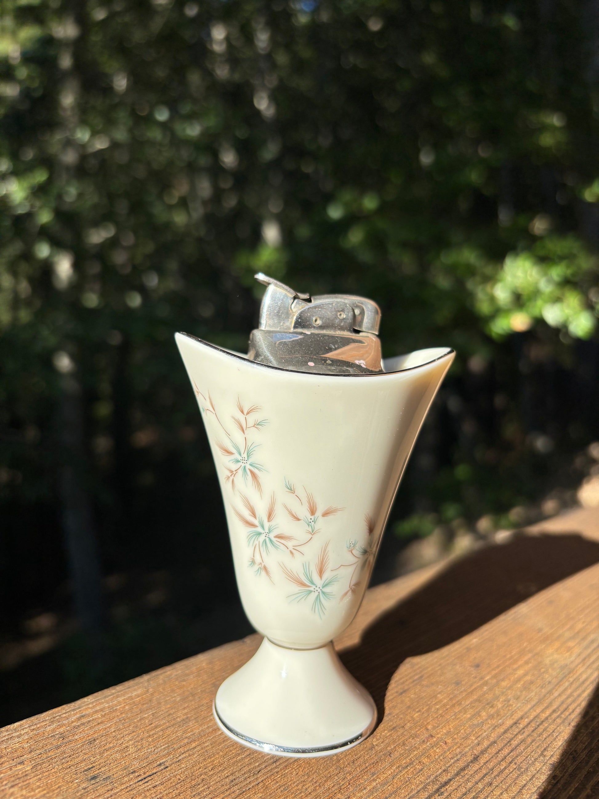 This Ceramic Evans Floral Table Lighter is in perfect working condition and features a beautiful floral design. Made with ceramic material, this table lighter adds a touch of elegance to any room. With a smooth, efficient operation, it is perfect for lighting candles, incense, and more.
