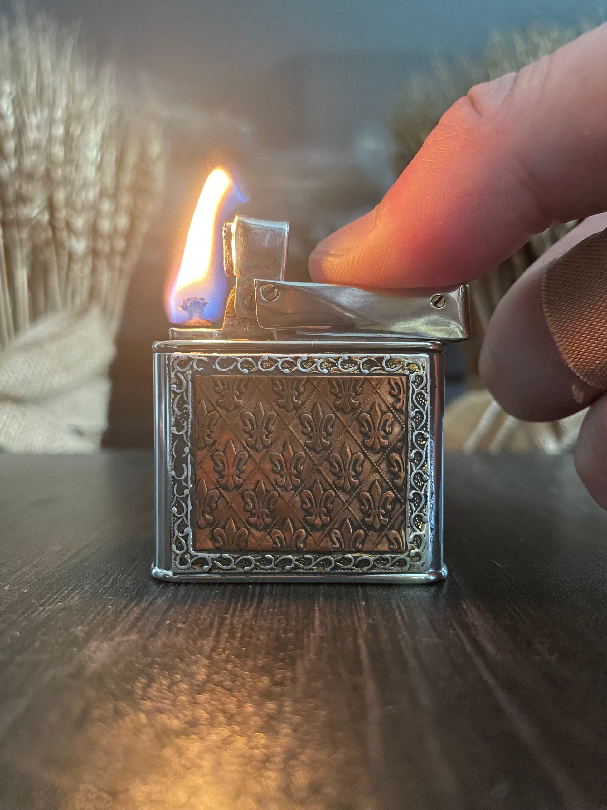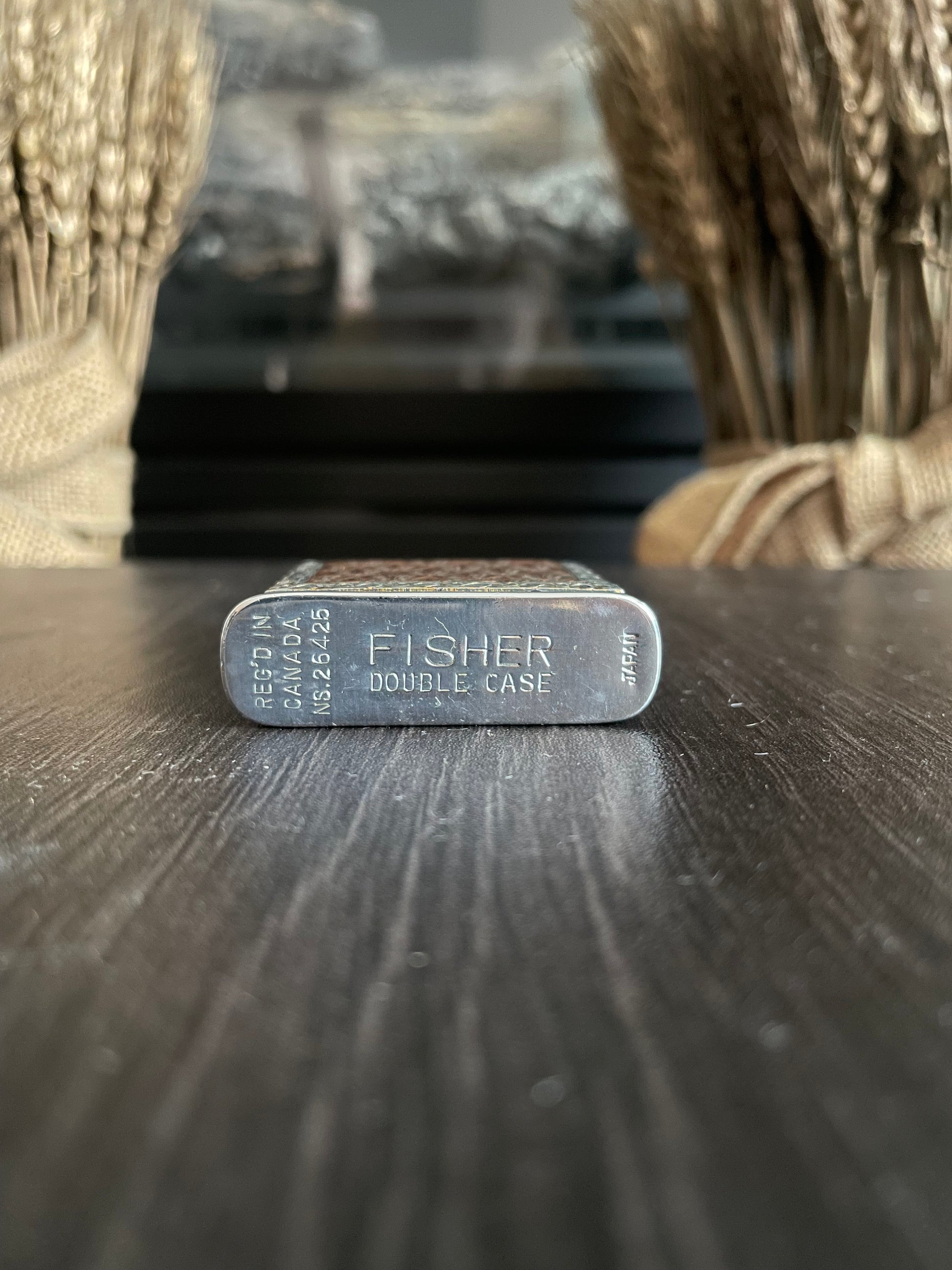 This Fisher "Double Case" Lighter is a true gem from the 1950s-60s. Its elegant semi automatic design, double case feature, and Canadian design with Japanese manufacturing make it a unique addition to any collection. Own a piece of vintage history with this stunning lighter.