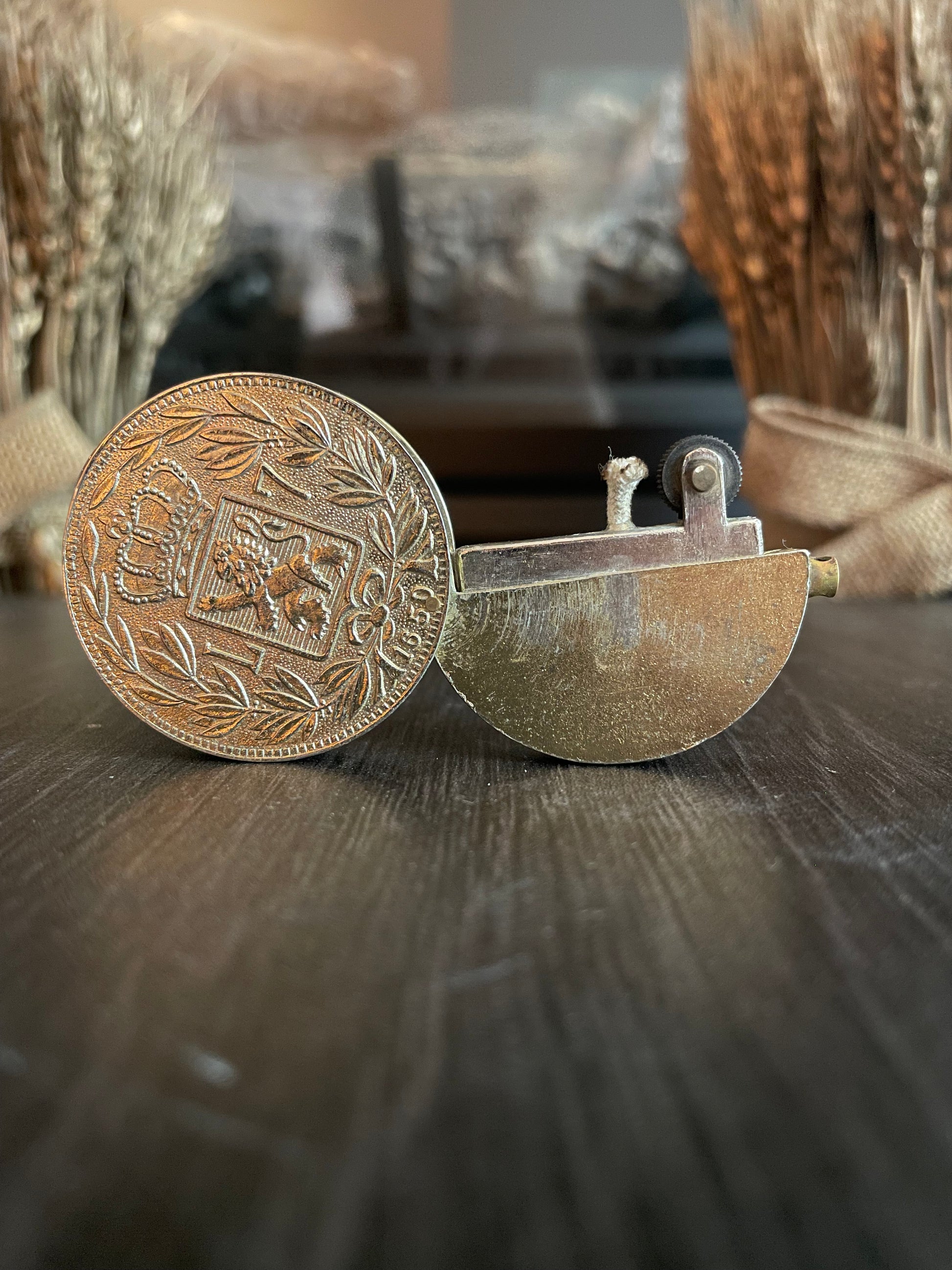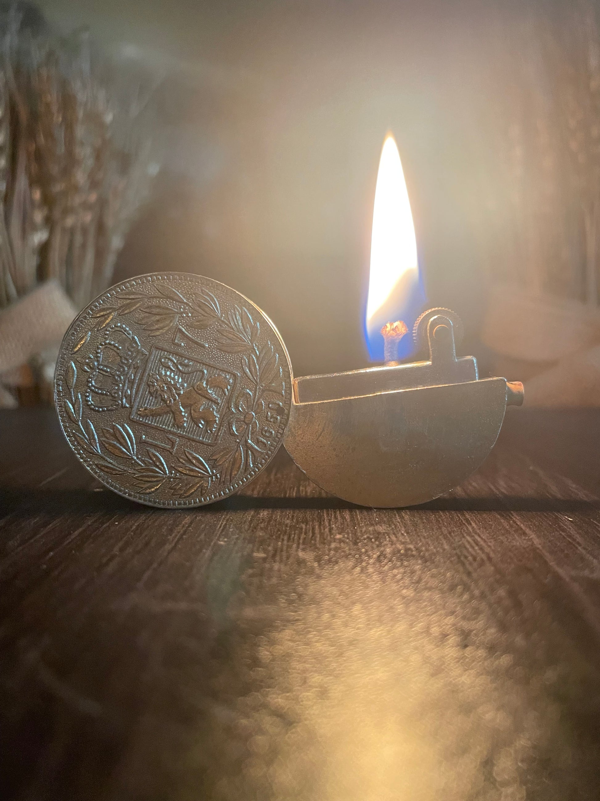 This vintage lighter is a collector's dream. Made in the 1960s, it features a gold coin from 1650 with a royal crown and lion emblem. Perfect for adding a touch of history and style to any collection.