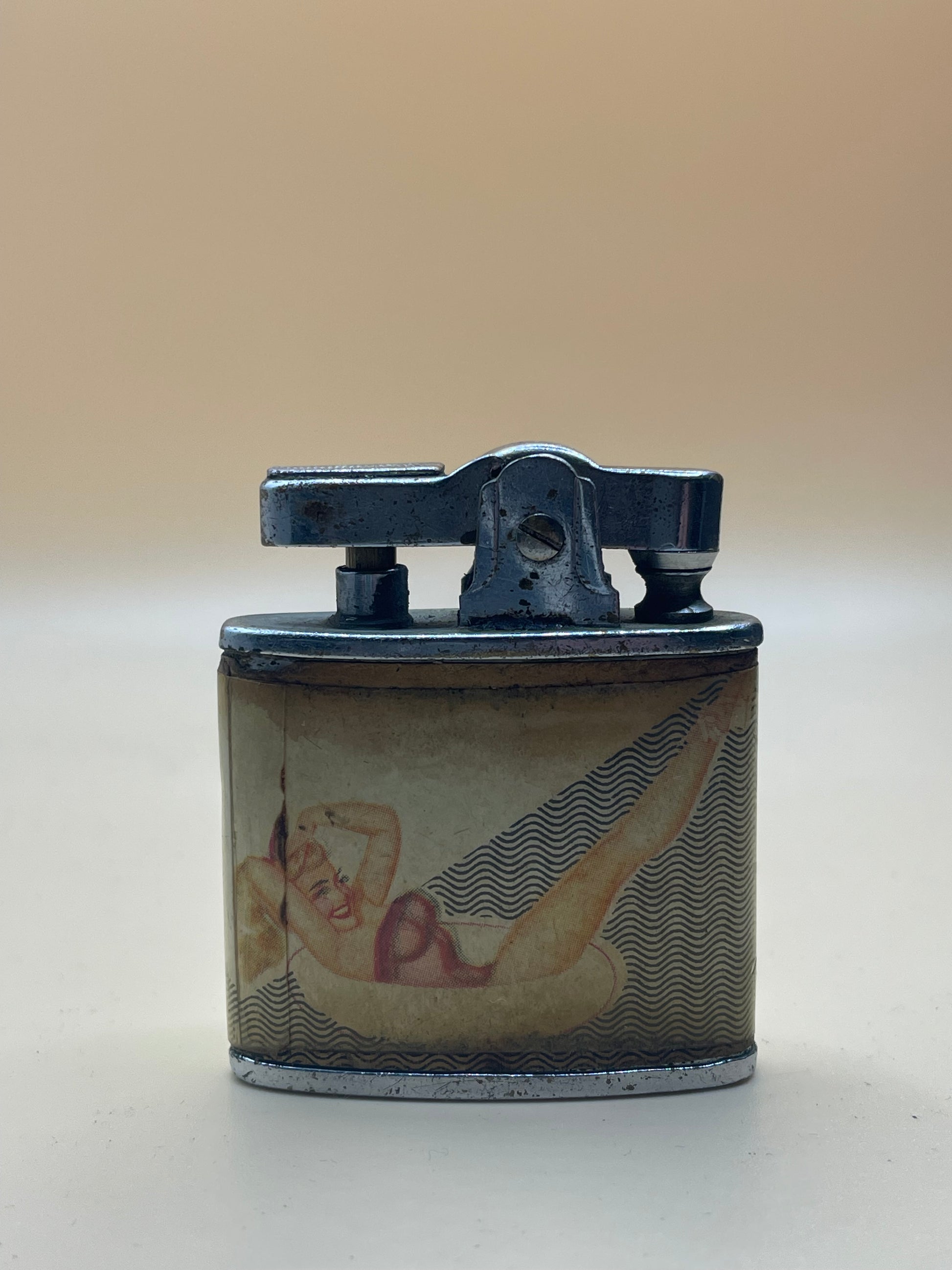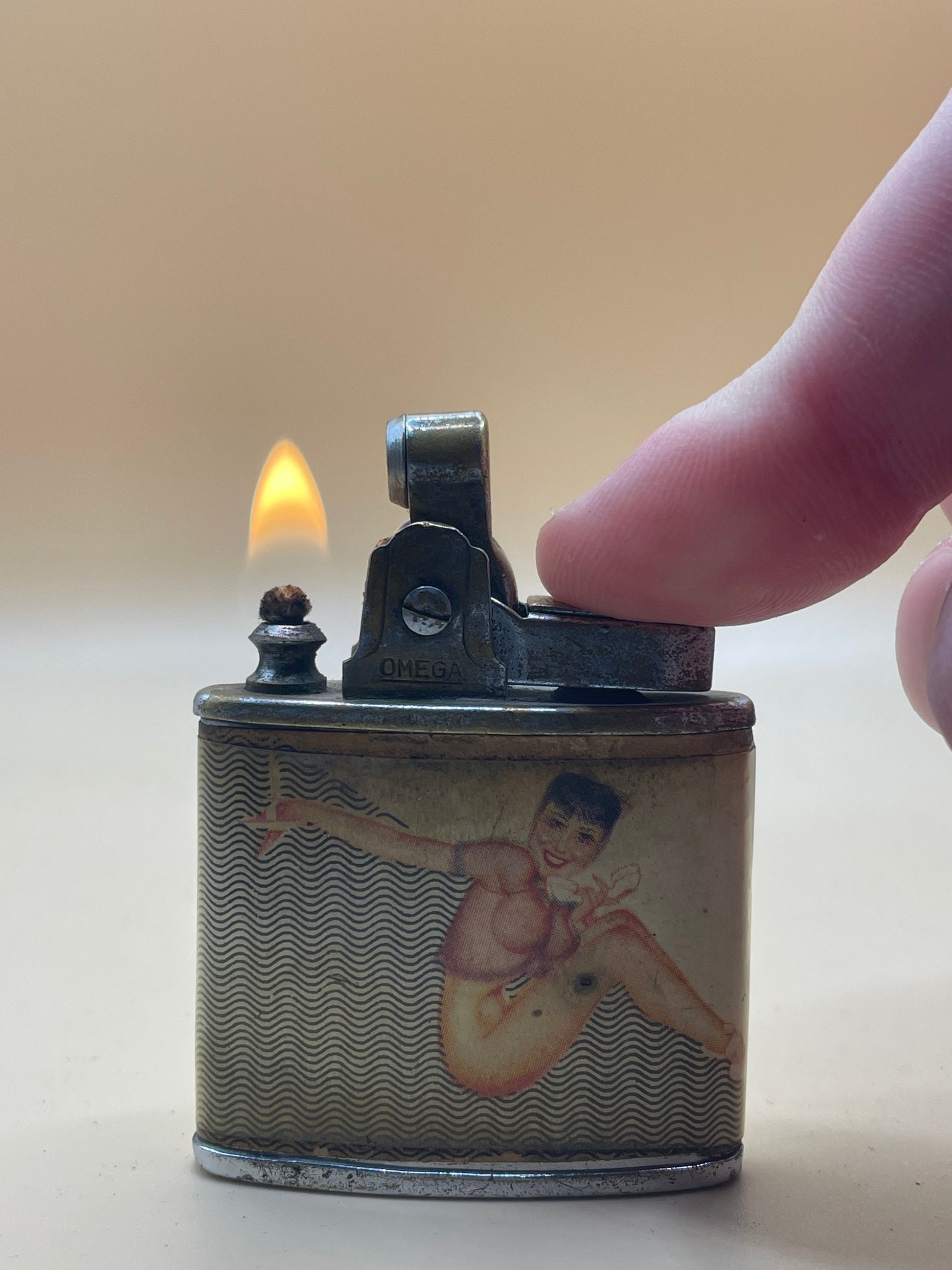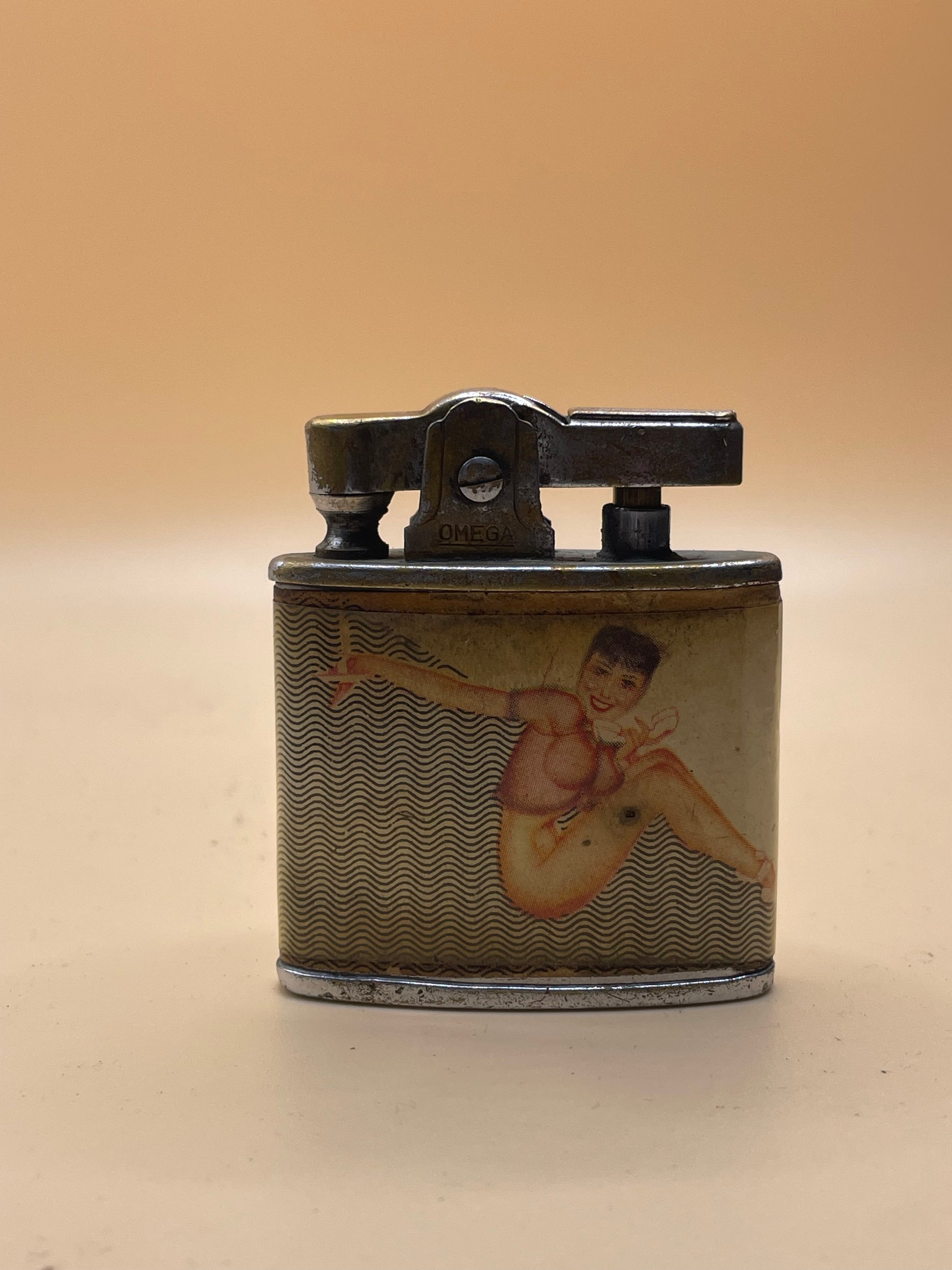 Experience the nostalgia and elegance with the Omega Superlighter featuring classic pin-up girls. This beautiful collector's piece, made by Omega, is in working condition, making it a must-have for any vintage lighter lover.