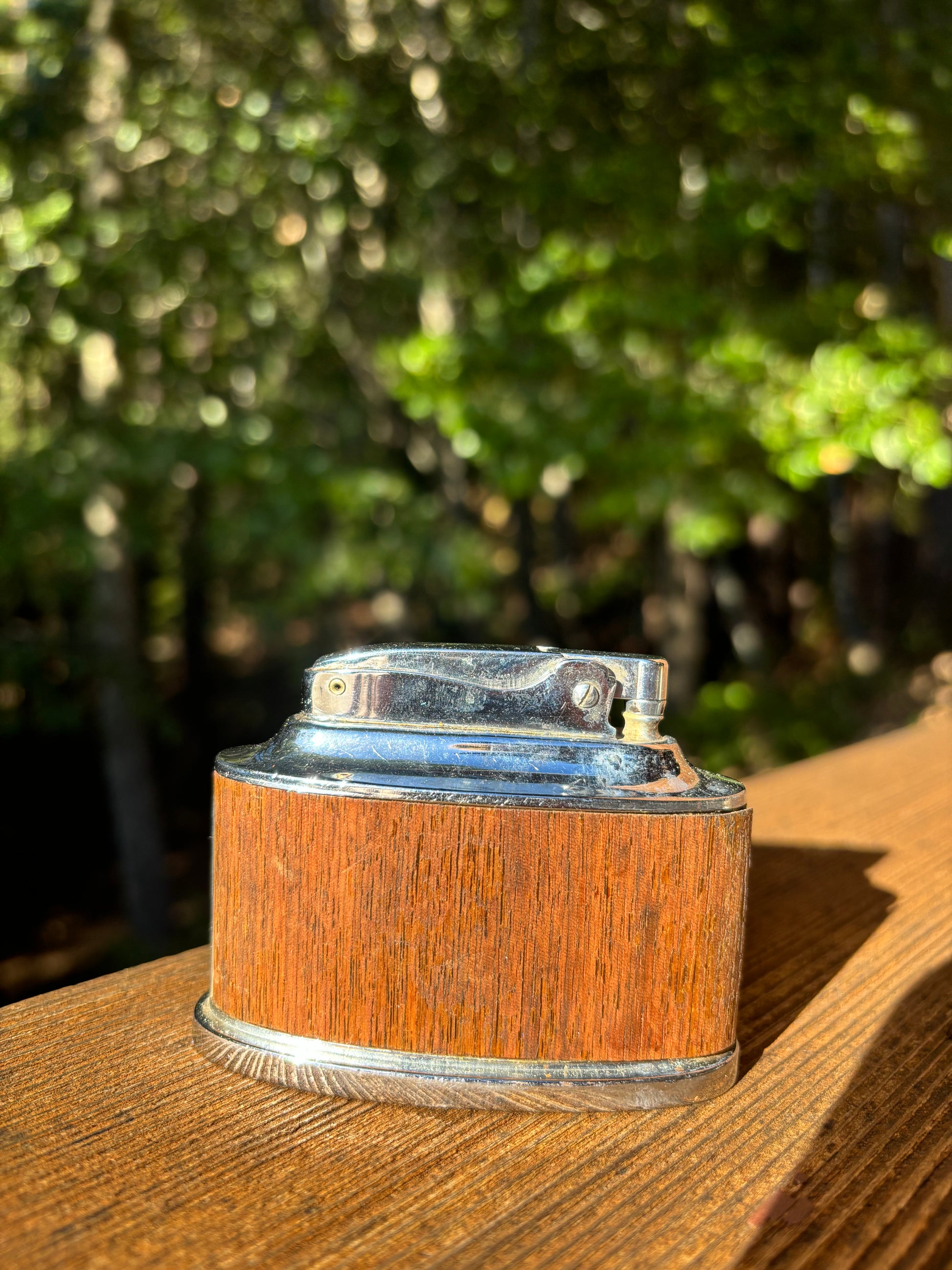 This Ronson Senator Table Lighter features a unique wood finish that adds character and charm. It may be peeling on one side, but that only adds to its vintage appeal. Fully restored and in working condition, this lighter is both functional and a conversation starter.