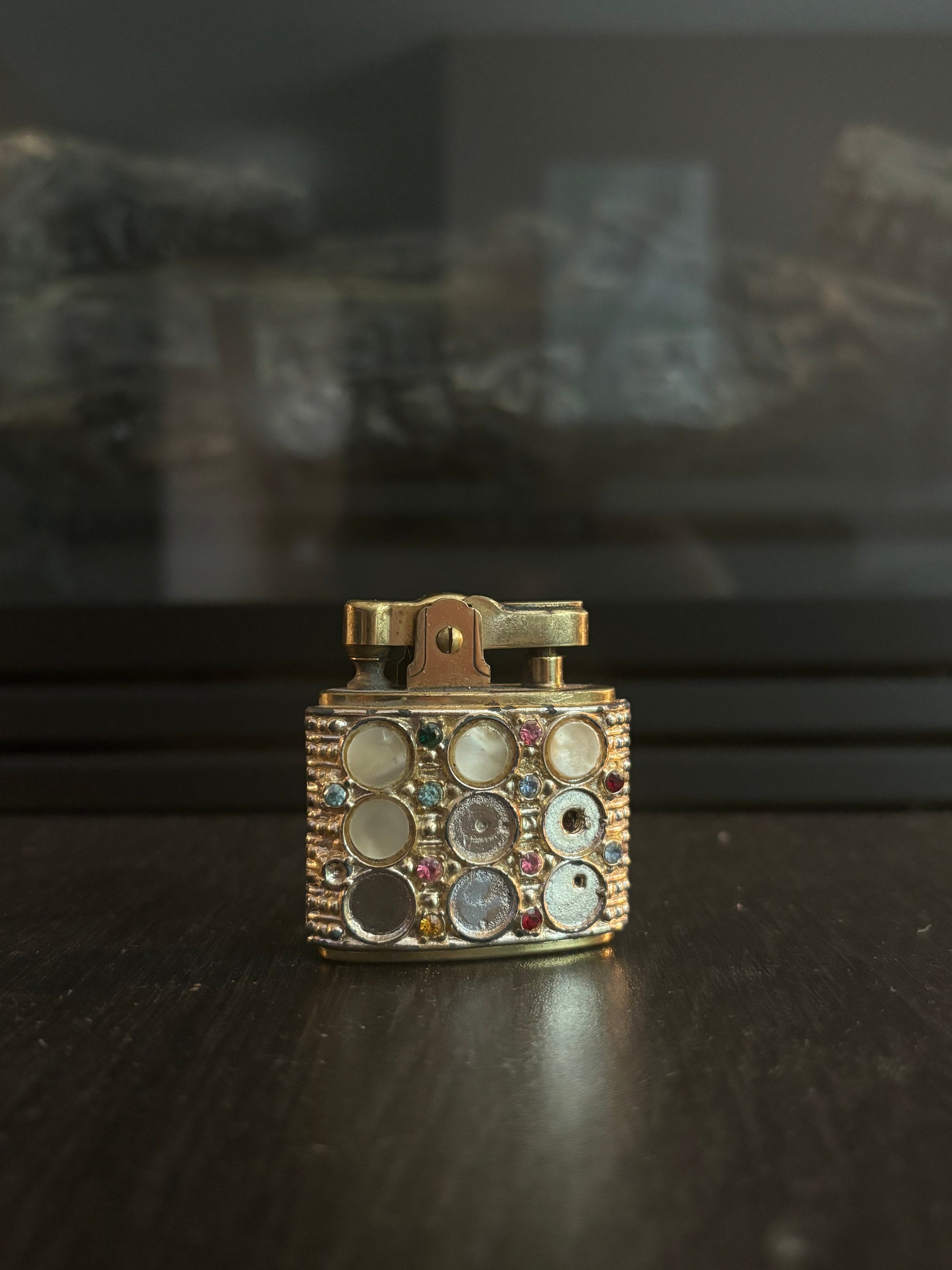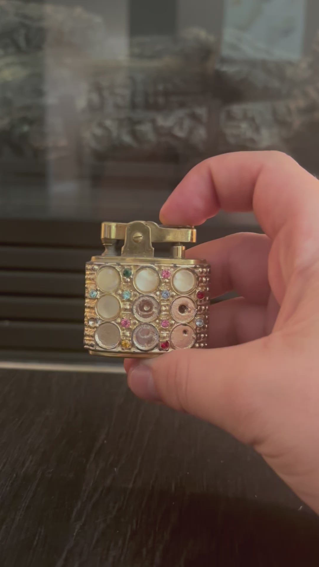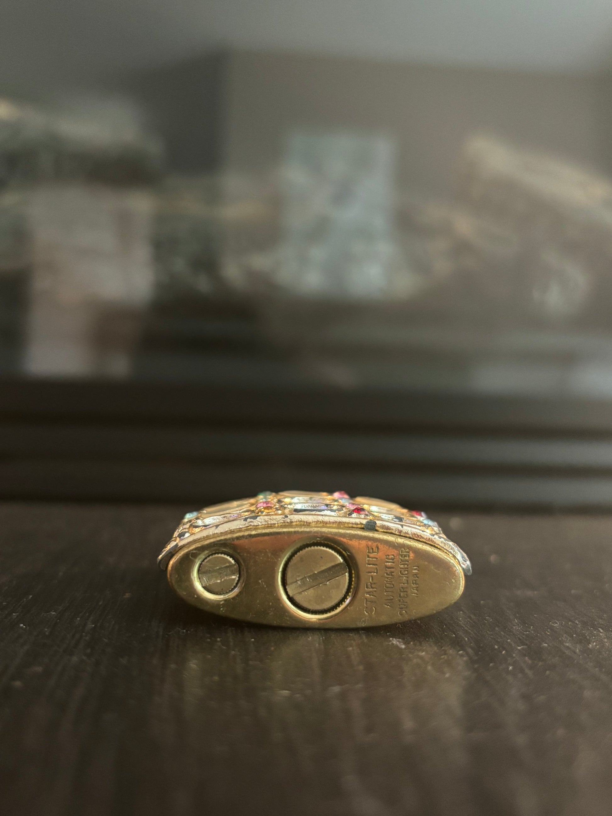 Introducing the Star-Lite Super Lighter! This automatic lighter from Japan boasts a unique bejeweled design, perfect for adding a touch of elegance to your smoking experience. Don't miss out on this c.1960 gem, with some missing pieces that only add to its vintage charm.