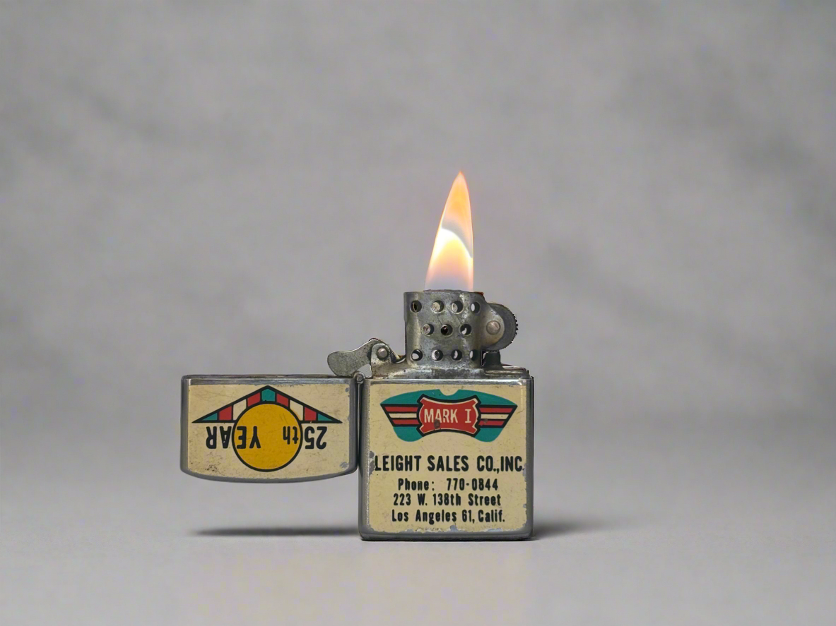 This c. 1960's Mark I 25th Anniversary lighter from Mark I sales company is a vintage treasure. Featuring a beautiful color scheme and a flip top design, it's perfect for anyone who loves vintage lighters. Celebrate the past while enjoying the convenience and style of this classic lighter.