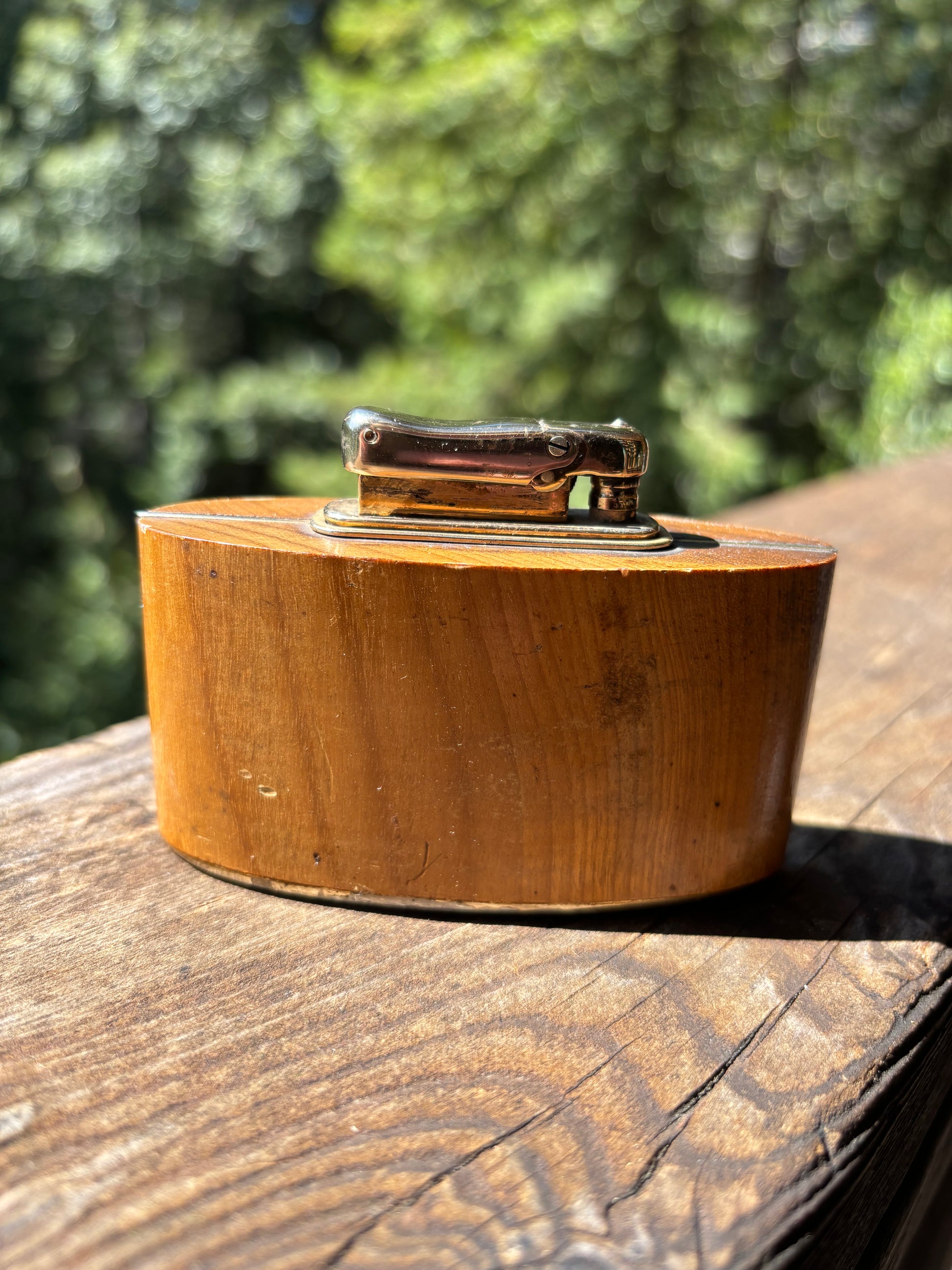 Light up your life with the Colibri Kreisler Tabletop Lighter. Made in West Germany in the US Zone, this fully restored and functional lighter features a beautiful wood finish that adds an elegant touch to any space. Don't miss out on this unique and quirky piece! Engraved with the name “EARL”.