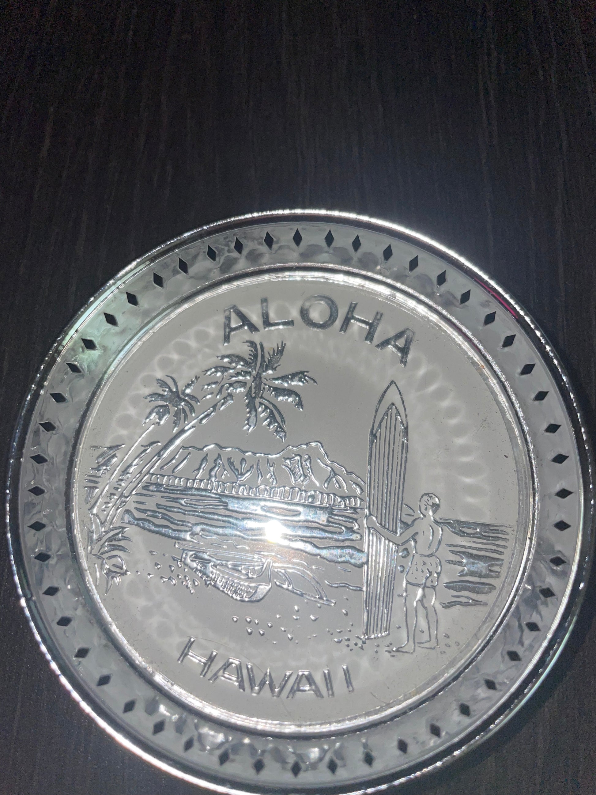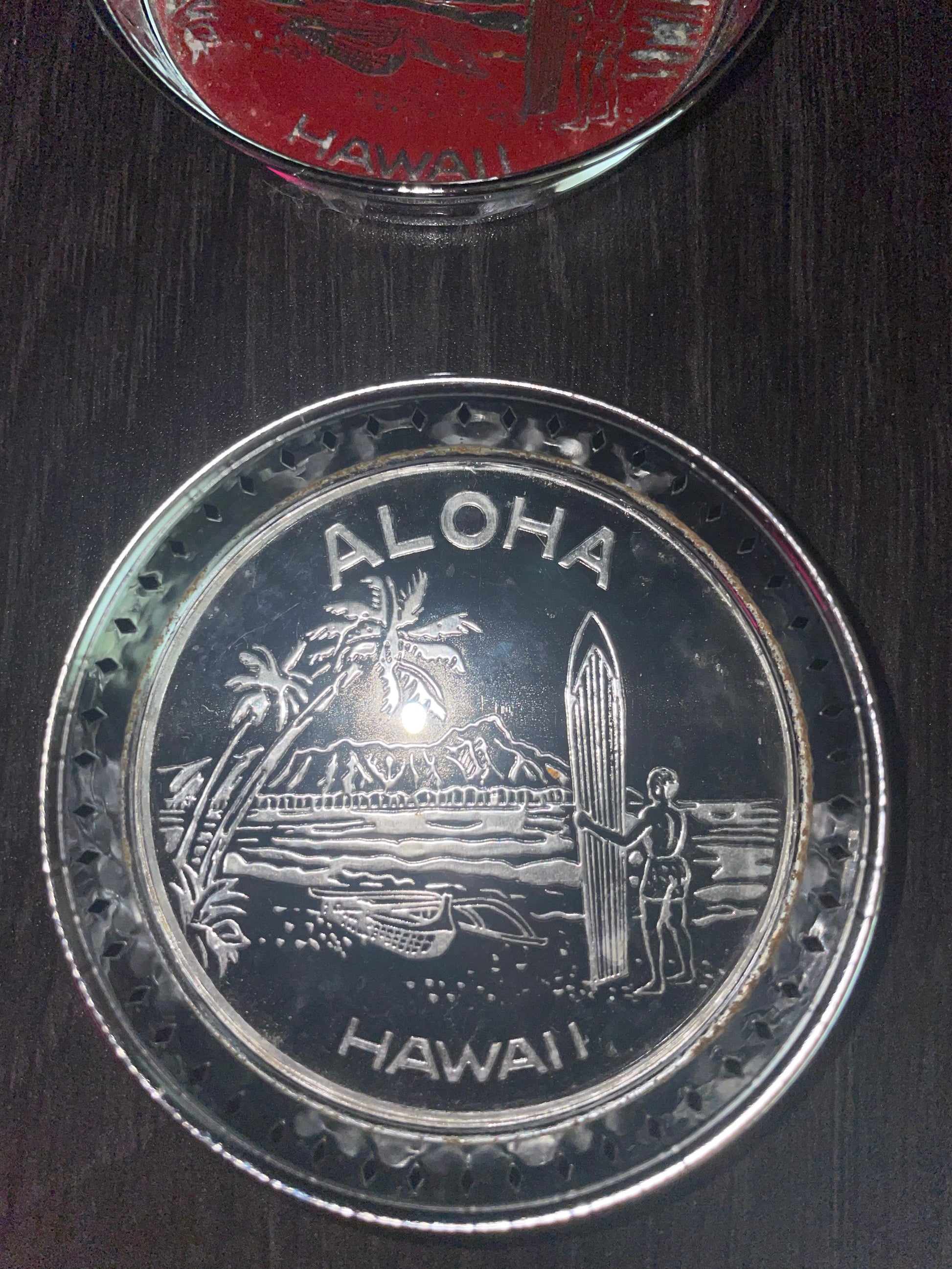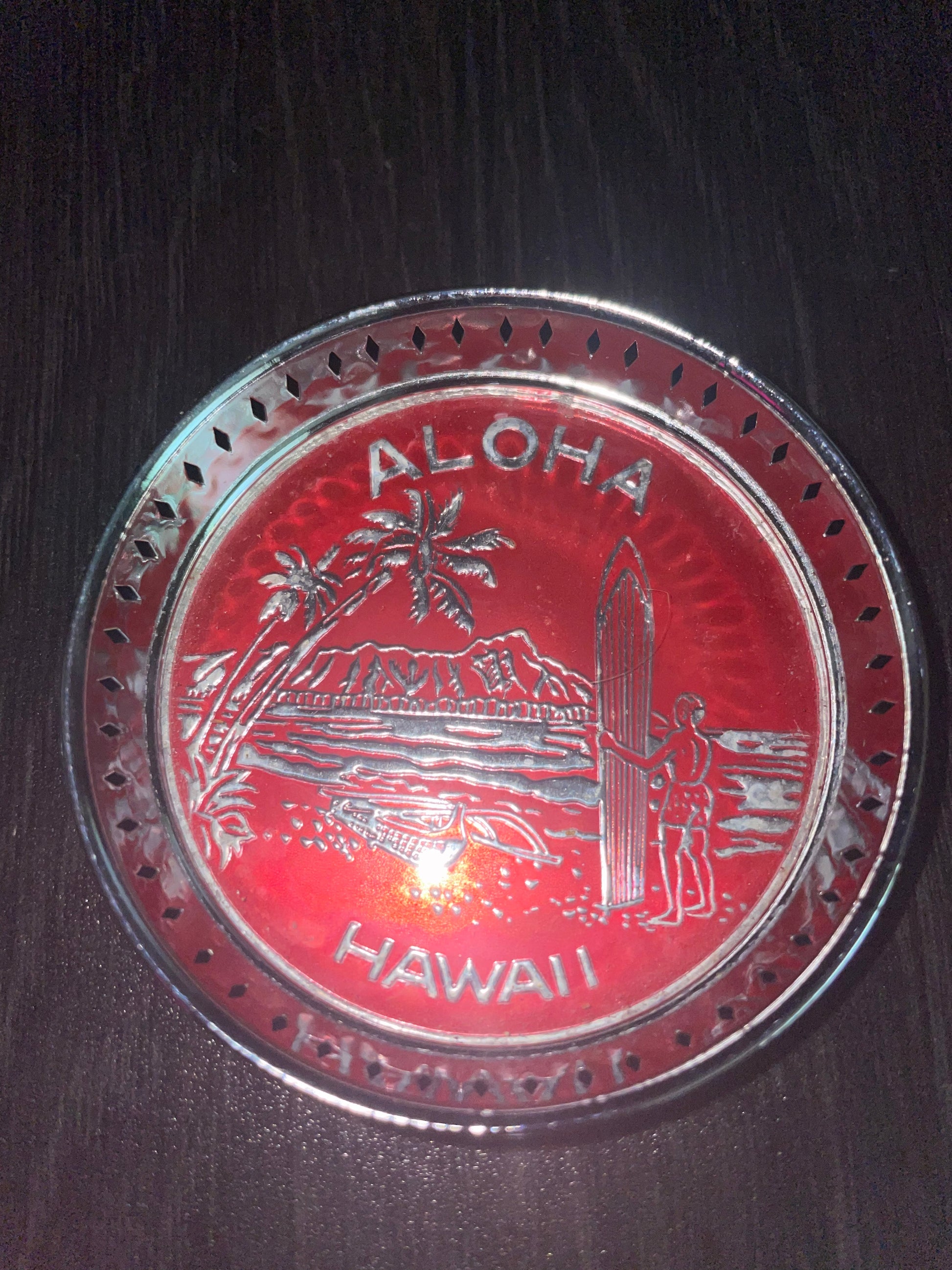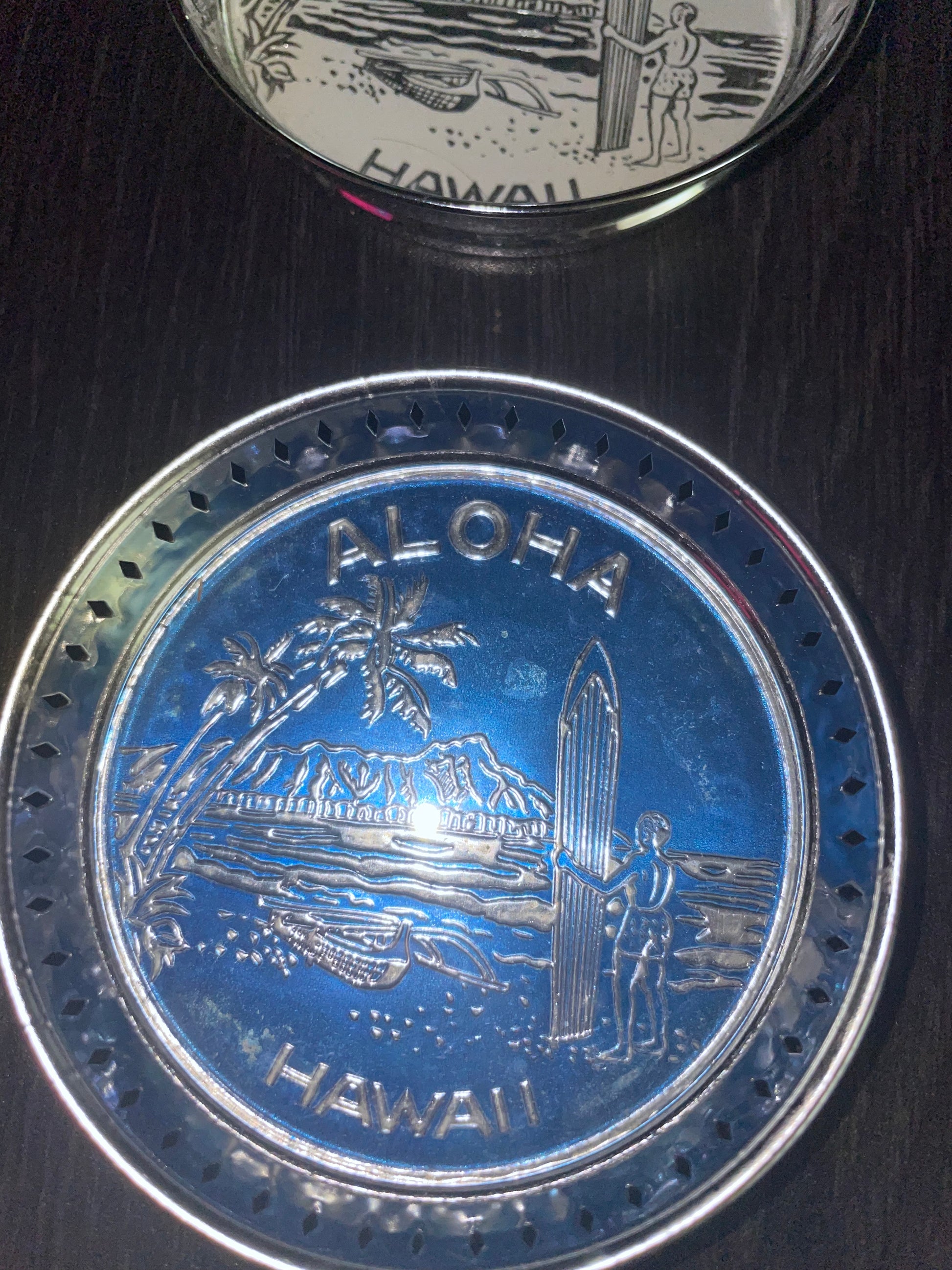 "Indulge in a touch of vintage charm with our set of 4 Hawaiian ashtrays! Featuring bold colors in black, blue, white, and red, each tray is adorned with the iconic 'aloha' greeting. Perfect for adding a tropical flair to any space and doubling as a convenient catch-all for small items. Aloha, relaxation and style all in one!"
