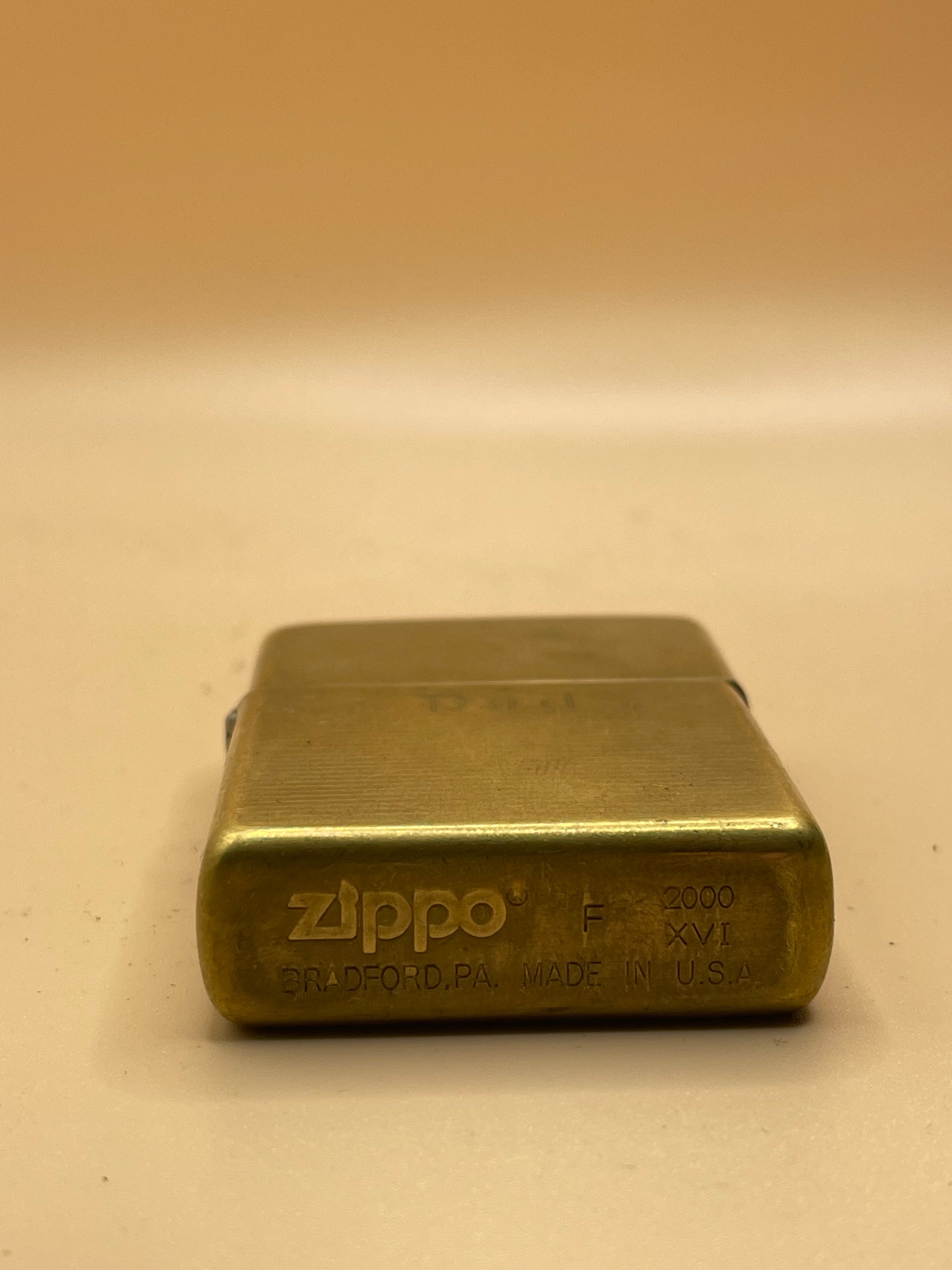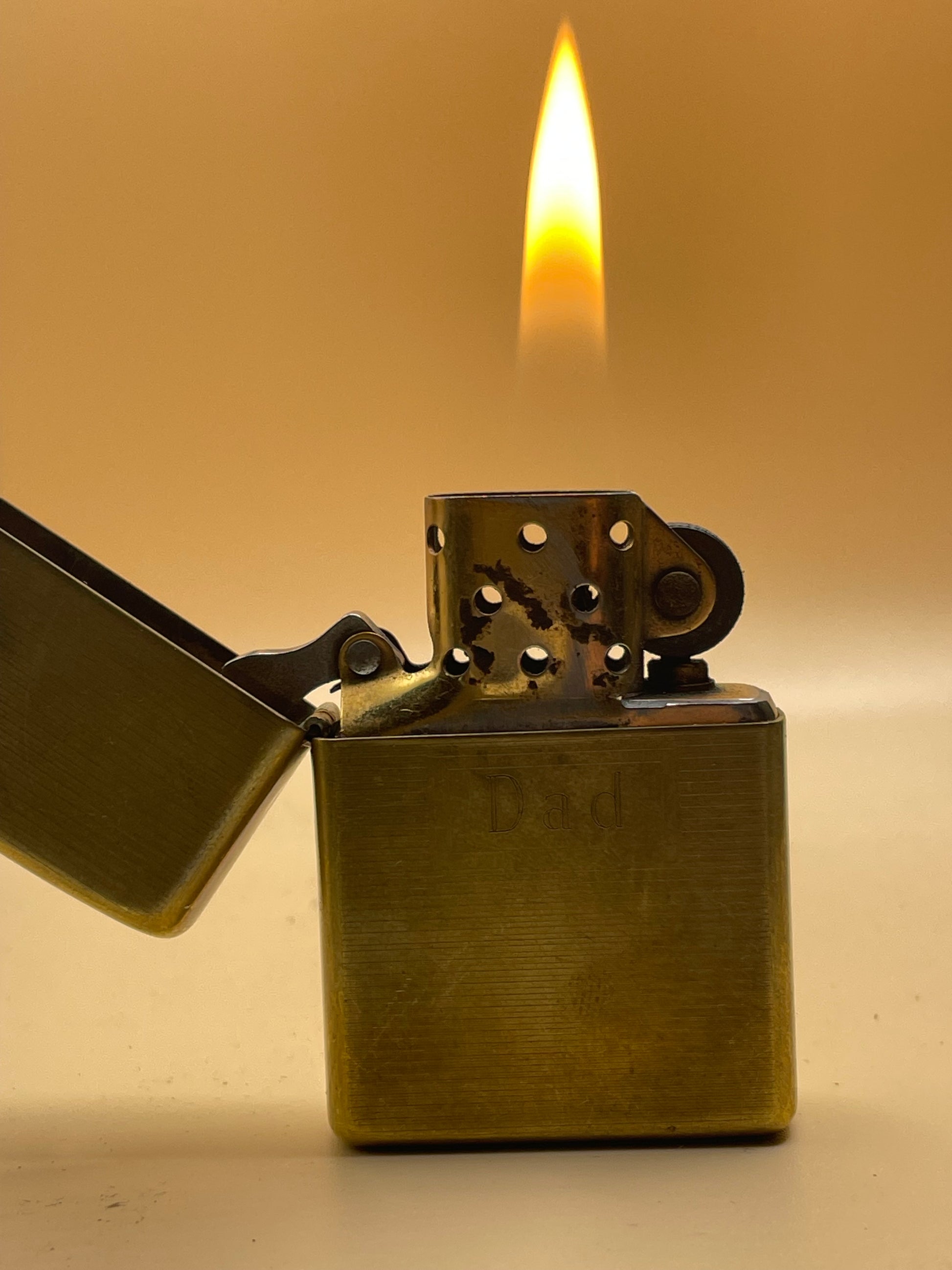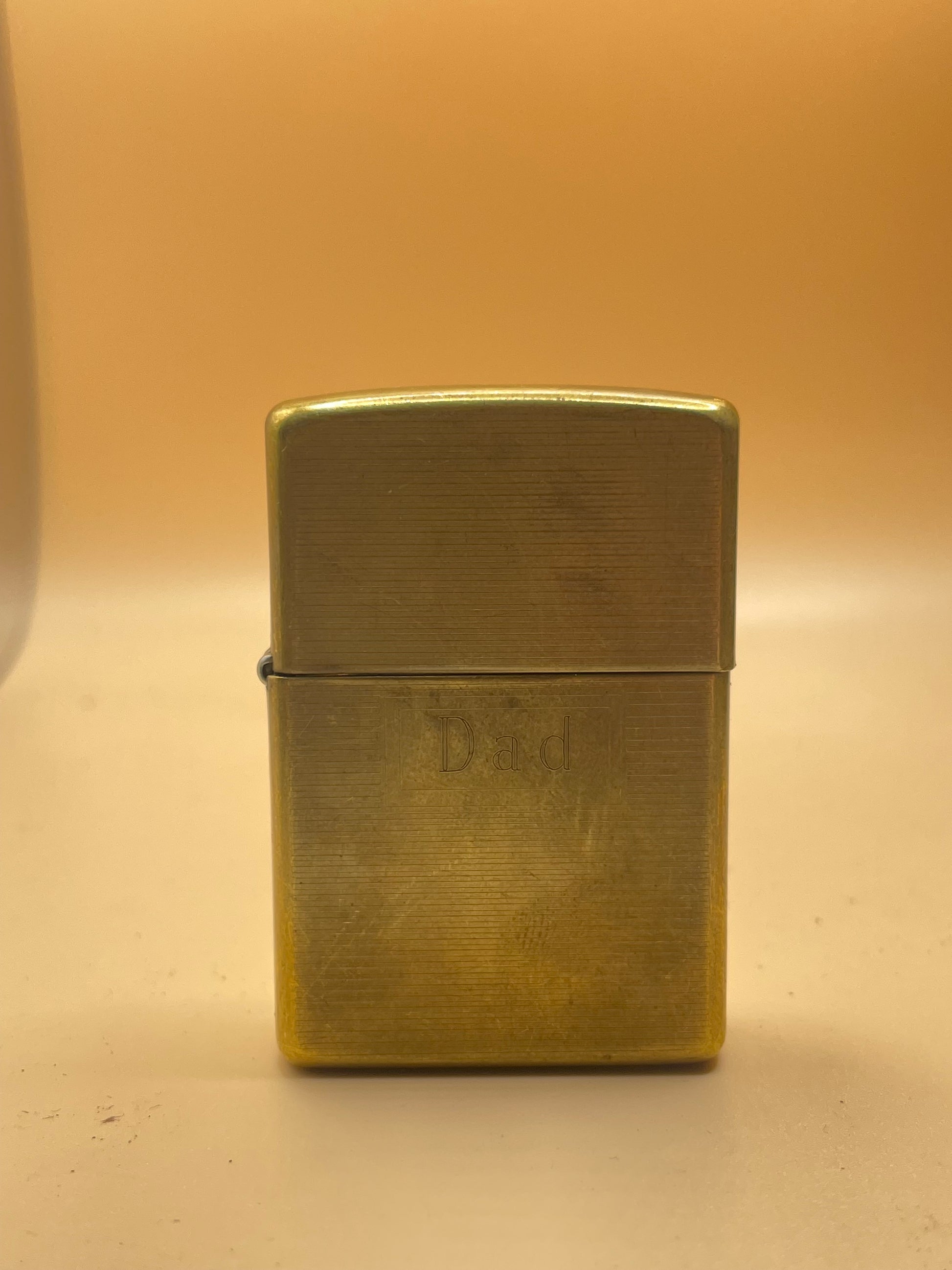 This charming gold-toned Zippo lighter bears the inscriptions "Dad" and "Love Lori" on either side. Fully functional and perfect for vintage enthusiasts.