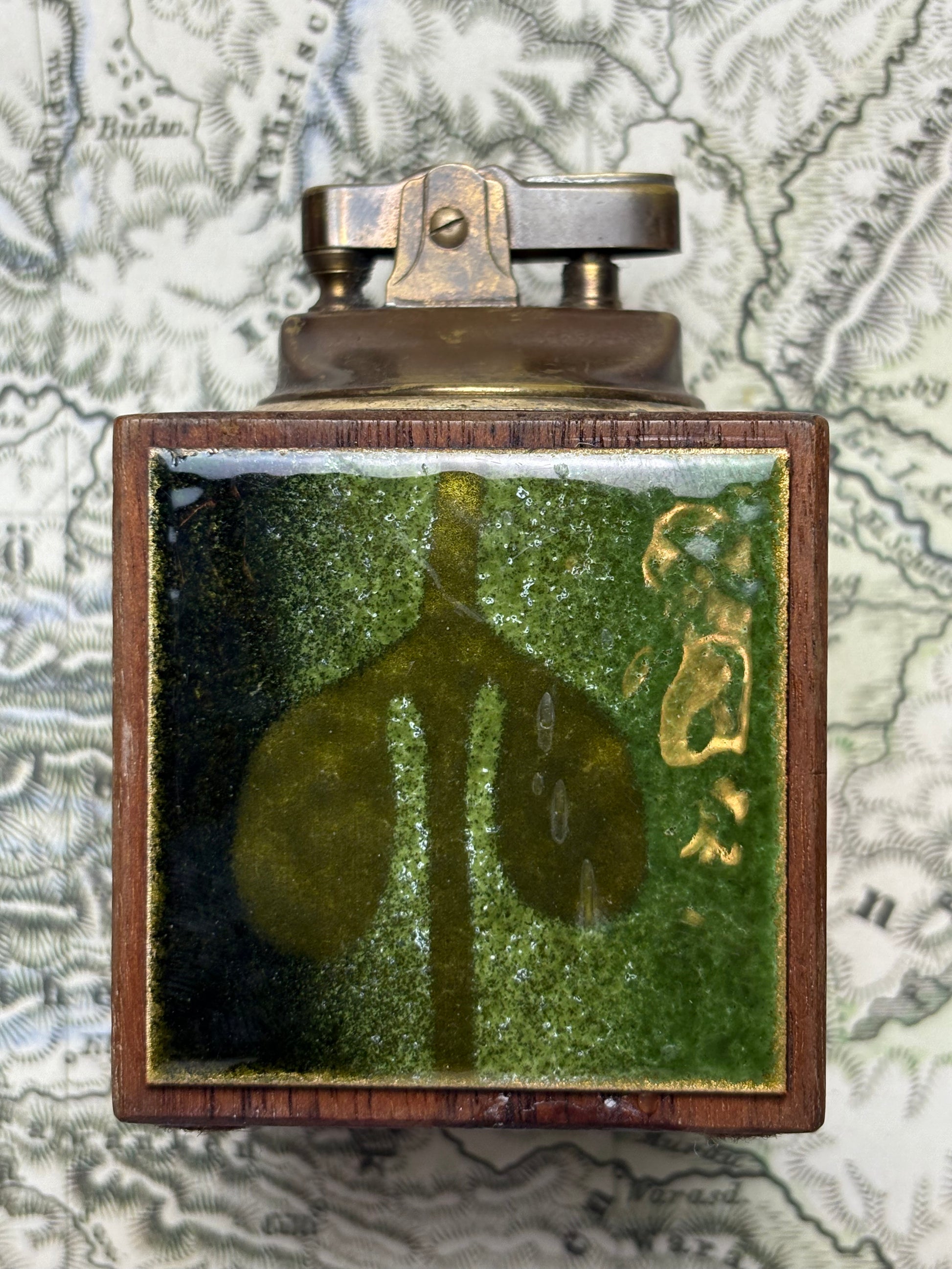 This vintage wooden table lighter boasts a beautiful design on one side, resembling lungs. Its working condition and metal insert make it a reliable and unique addition to any collection or decor. Expertly crafted with wood, this lighter combines style and functionality.